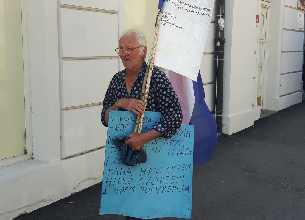 On je naime središtem grada prošetao s hrvatskom trobojnicom i s transparentima, vičući protiv vladajućih, ali i oporbe. Na naš upit protiv koga protestira, rekao je: “protiv političara!”. Vidno uznemiren i povišenog tona objašnjavao je kako nitko od političara ne mari za malog čovjeka i da su sami sebi dovoljni, prozivajući “i lijeve i desne”. Zastao je na Trgu Ljudevita Gaja, gdje su ga ljudi fotografirali, no on se nije dao omesti te ih je pozivao da pročitaju natpise koje nosi. Mnogi su pritom govorili “da je stari prolupao”, jer uistinu njegovi natpisi nisu bili previše razumljivi, niti su svi bili smisleni, govore i o zagađenju prirode i o lošim odnosima sa susjedima, no ono što je neosporno jest da je starac na rubu očaja. Čovjek se zapita, jesu li možda njegove kritike dijelom ipak upućene na pravu adresu?