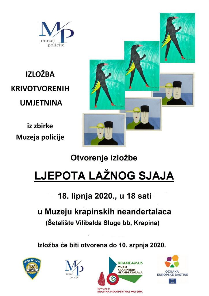 Nakon što je uspješno prezentirana u Gradskoj galeriji Zabok, izložba krivotvorenih umjetnina “Ljepota lažnog sjaja”, u organizaciji Muzeja policije i Policijske uprave krapinsko-zagorske, u četvrtak se seli u Muzej krapinskih neandertalaca u Krapini. Otvorenje izložbe, čija je autorica Helena Biočić, voditeljica Muzeja policije, bit će u 18 sati, a izložba ostaje otvorena do 10. srpnja te će se moći razgledati utorkom i petkom od 9 do 17 te subotom i nedjeljom od 10 do 18 sati. Na izložbi će se naći najzanimljiviji izlošci iz zbirki Muzeja policije, koju čine krivotvorine, većinom ulja na platnu i nekoliko skulptura. Bit će prikazano nekoliko desetaka krivotvorenih umjetnina poznatih svjetskih autora poput S. Dalija i P. A. Renoira, ali i hrvatskih autora M. Berbera, E. Murtića, I. Generalića te mnogih drugih. Sve krivotvorine su dio Kriminalističke zbirke Muzeja policije koja danas broji šezdesetak predmeta. Svrha izložbe je osvijestiti javnost na nužan oprez pri kupnji vrijednih umjetnina te osnažiti borbu protiv crnog tržišta. Tu je i edukativan pristup koji će budućim kupcima umjetnina ukazati na suvremene metode vještačenja sumnjivih umjetničkih djela i upozoriti na što moraju obratiti pažnju kod kupnje umjetnina.