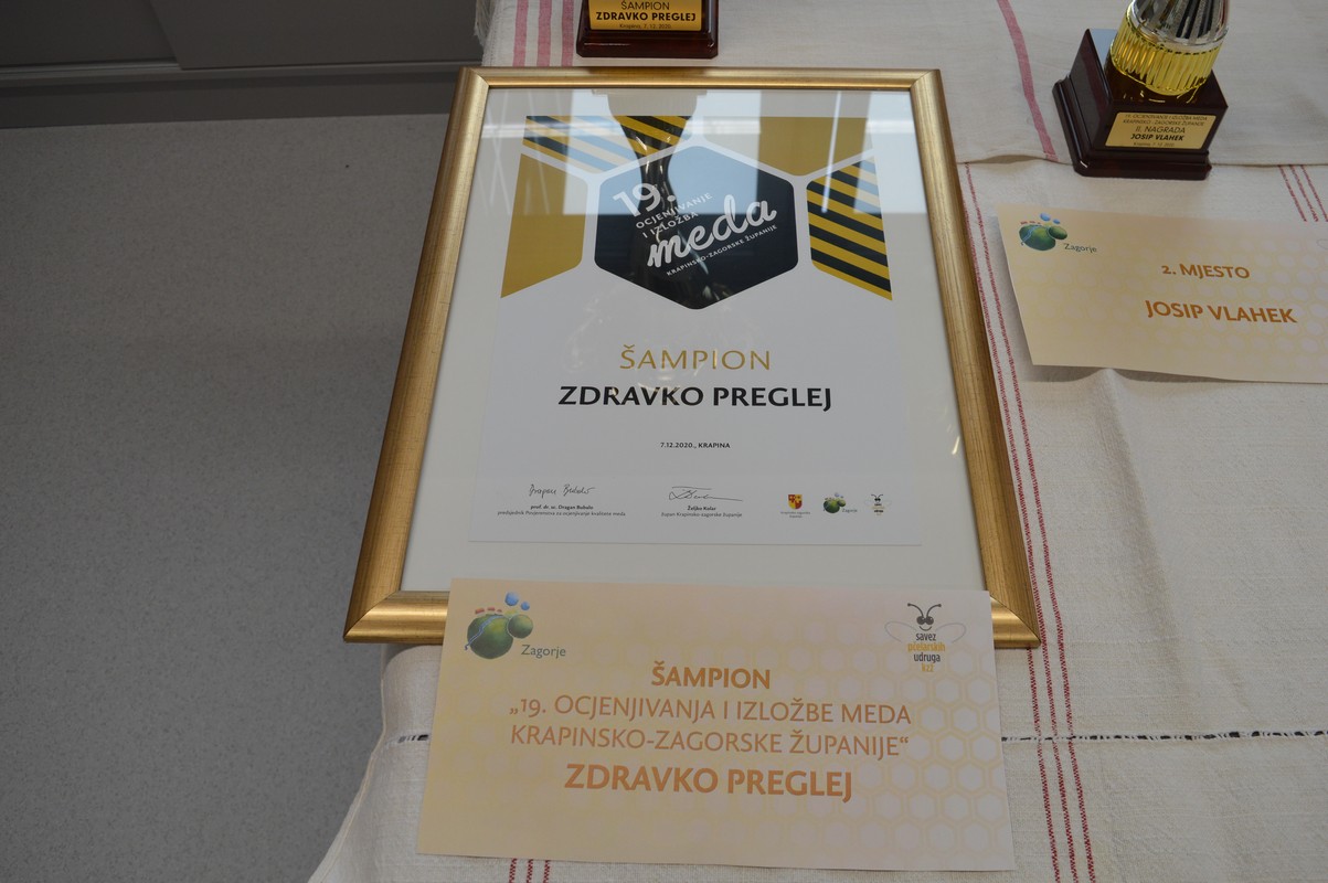 Zlatna odličja osvojili su bagremov med Stjepana Ožegovića iz Donje Batine, cvjetni med Josipa Draškovića iz Rusnice, kestenov med Josipa Vlaheka iz Lobora i medun Zdravka Pregleja iz Pregrade. Nagradu za najbolje ocijenjeni med pčelarke osvojila je Amalija Curiš iz Krapina Sela, za med od lipice, koji je nagrađen i u kategoriji najboljeg meda proizvedenog izvan pašnog područja KZŽ. U kategoriji meda proizvedenog na pašnom području KZŽ od strane pčelara izvan KZŽ, nagrađen je Josip Derniković iz Vrapča, za cvjetni med proizveden na području Gorenje Stubice.