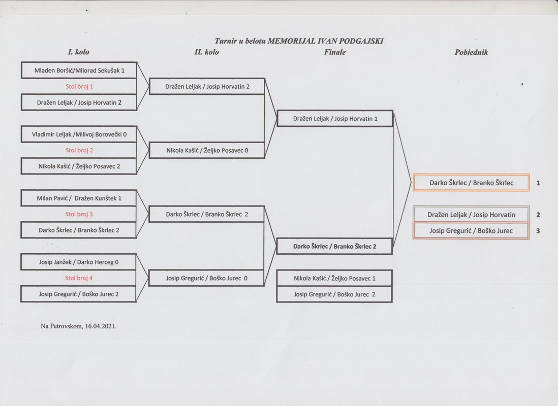 U organizaciji Udruge dragovoljaca i veterana Domovinskog rata Krapinsko – zagorske županije, pridržavajući se propisanih epidemioloških mjera Nacionalnog stožera civilne zaštite RH, uz financijsku potporu Ministarstva hrvatskih branitelja, Krapinsko-zagorske županije, Općine Petrovsko i Vetropack Straža Hum na Sutli , u prostorijama Dobrovoljnog vatrogasnog društva Petrovsko u petak 16. travnja, u spomen na prerano preminulog časnika Hrvatske vojske Ivana Podgajskog, održan je Osmi memorijalni turnir u belotu “Ivan Podgajski“.