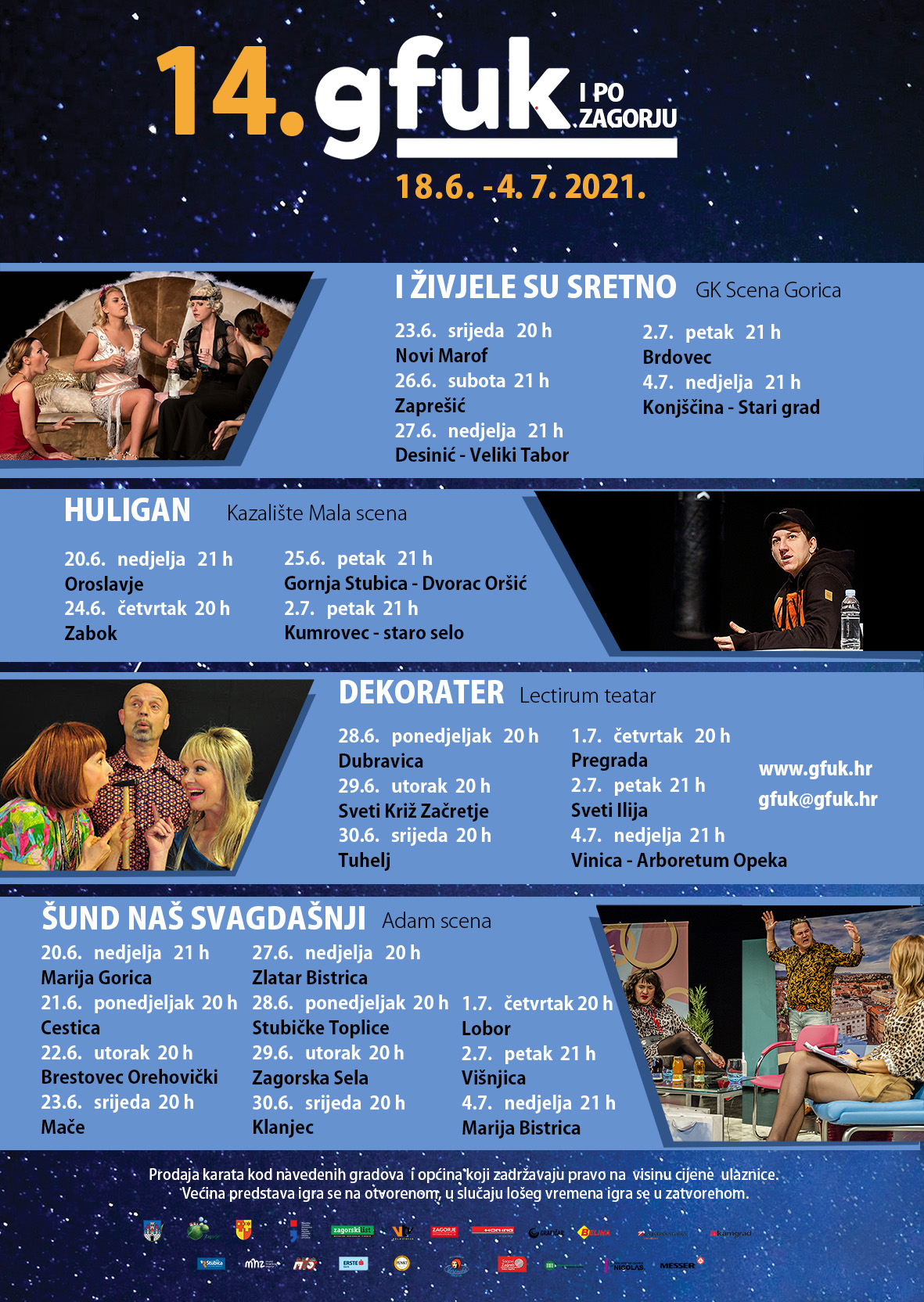 Končić je otkrio i da će u sklopu Glumačkog festivala po Zagorju također igrati četiri naslova – “Huligan”, monodrama sa zagorskim glumcem Matijom Šakoronjom, “I živjele su sretno” Gradskog kazališta Velika Gorica, “Dekorater”, predstava u kojoj igraju poznata glumačka imena Ksenija Pajić i Goran Grgić te hit komedija “Šund naš svagdašnji”.