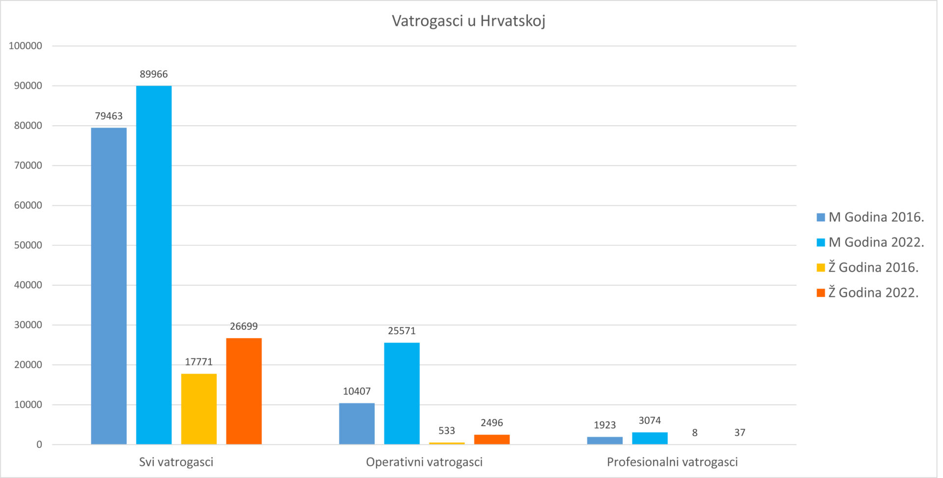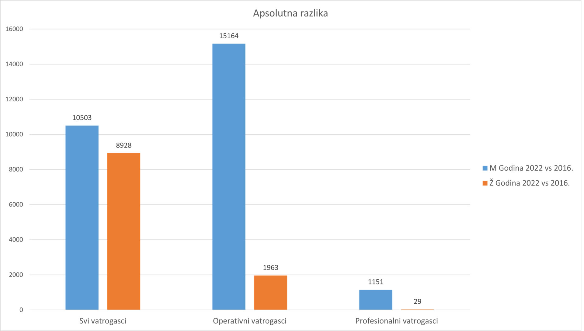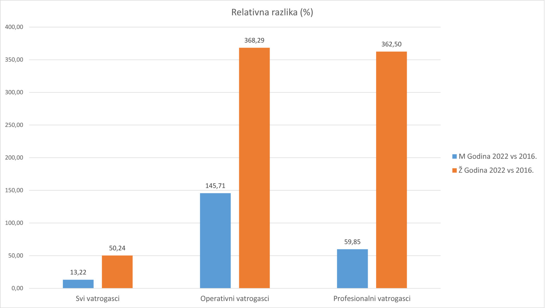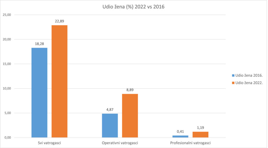 Kada uspoređujemo razliku između ove i 2016. godine, tada je vidljivo kako je broj muškaraca u proteklih šest godina na ukupni broj muškaraca i žena u vatrogastvu povećan za 13 posto , a žena 50 posto. U kategoriji operativnih vatrogasaca broj vatrogasaca povećao se gotovo dva i pol puta, dok se broj vatrogaskinja povećao skoro pet puta. U profesionalnom vatrogastvu zabilježen je značajan rast pa je tako kod vatrogasaca došlo do porasta za gotovo 60%, dok se broj profesionalnih vatrogaskinja učetverostručio. Ukratko, u hrvatskom vatrogastvu žene čine gotovo 23 posto, što je u odnosu na 2016. godinu kada je udio žena iznosio 18 posto vidljiv porast. Također, i u operativnom vatrogastvu je broj vatrogaskinja narastao s 5 posto na 9 posto, a u profesionalnom vatrogastvu s 0,41 posto na 1,19 posto.