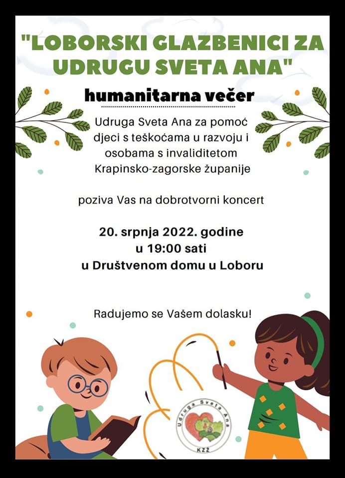 U Društvenom domu u Loboru će se 20. srpnja s početkom u 19 sati održati humanitarna večer, a radi se o dobrotvornom koncertu pod imenom “Loborski glazbenici za Udrugu Sveta Ana”.