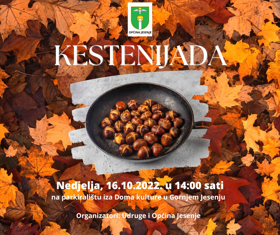 Ove nedjelje, s početkom u 14 sati, na parkiralištu kod Doma kulture u Gornjem Jesenju održat će se tradicionalna ‘Kestenijada’ u organizaciji Općine i udruga koje djeluju na području općine.