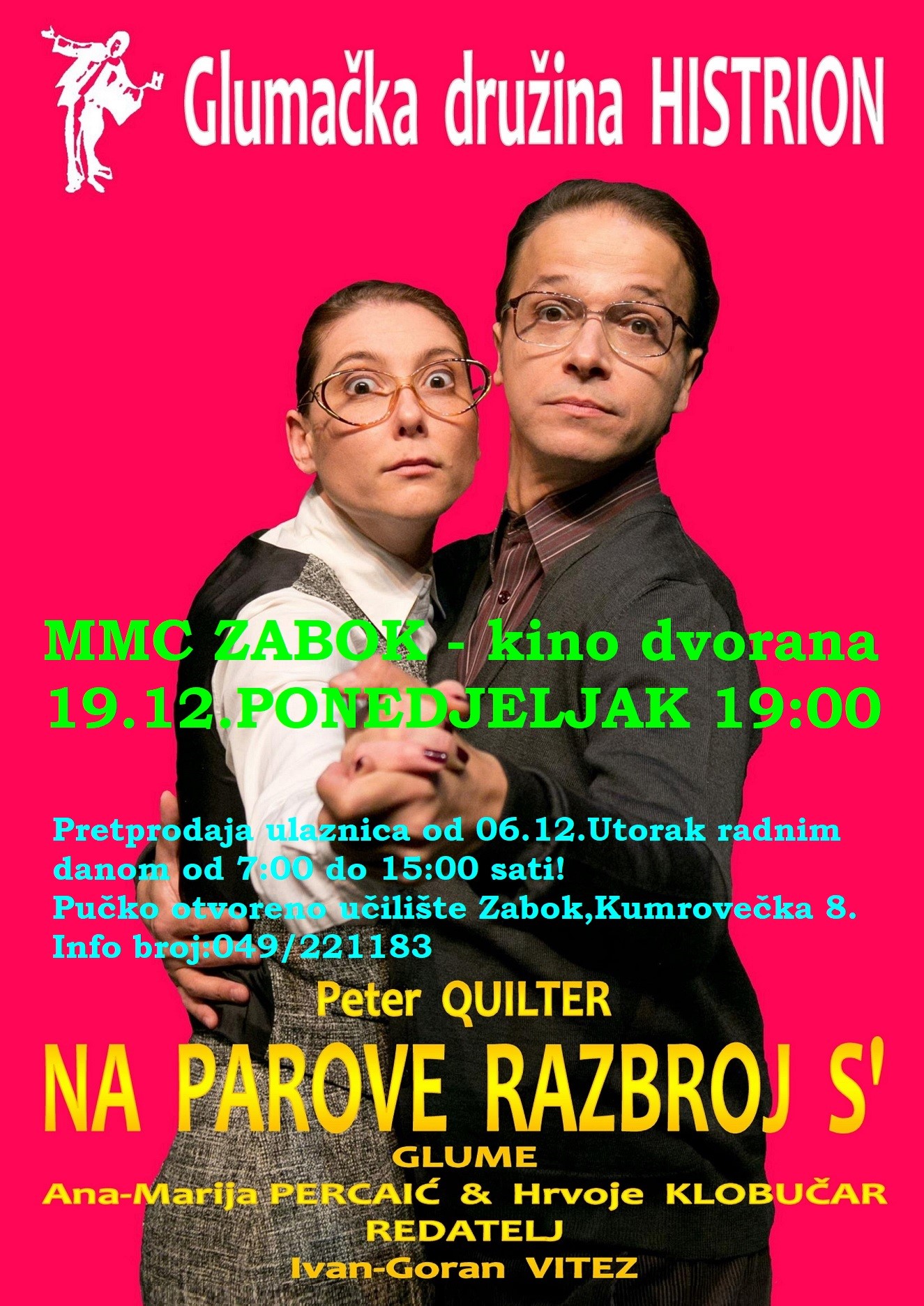 U Multimedijalnom centru Zabok, u ponedjeljak će se, s početkom u 19 sati, u organizaciji Pučkog otvorenog učilišta Zabok i Multimedijalnog centra Zabok, odigrati kazališna predstava glumačke družine Histrion “Na parove razbroj s“. Predstava traje 120 minuta, a cijena ulaznice iznosi 50 kuna, odnosno 6,64 eura. Dodatne informacije o ulaznicama mogu se dobiti putem telefona na broj 049/221-183.