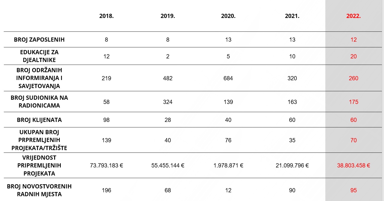 Ispričala je i kako je pripremljeno 25 projekata u sektoru poduzetništva, u vrijednosti 37,3 milijuna eura gdje se očekuju bespovratna sredstva u iznosu od 22,3 milijuna eura, a u sektoru ruralnog razvoja 45 projekata gdje se očekuju bespovratna sredstva od 1,4 milijuna eura. Paralelno, pružaju se i usluge provedbe projekata pa su za klijente praćena tri projekta u iznosu od 4,8 milijuna eura s očekivanim bespovratnim sredstvima od 1,7 milijuna eura, a u sektoru ruralno razvoja prati se 38 projekata ukupne vrijednosti preko četiri milijuna eura gdje se očekuju bespovratna sredstva u iznosu od 2,8 milijuna eura.
