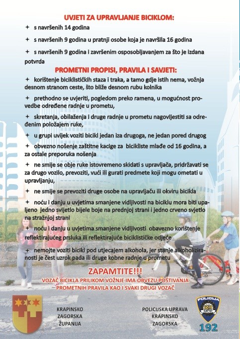 Na startu 10. zabočke “Kukurijade“ proteklog vikenda, koju je organizirao Rekreativni biciklistički klub “Ku-Ku-Ri-Ku” u suradnji s Koordinacijskim odborom akcije “Grad Zabok-prijatelj djece”, Društvom “Naša djeca” Zabok i Zavodom za javno zdravstvo KZŽ povodom Svjetskog dana sporta (25. svibnja) i Svjetskog dana nepušenja (31. svibnja), policijski službenici Policijske uprave krapinsko – zagorske i Policijske postaje Zabok proveli su preventivnu aktivnost “Biciklirajmo sigurno“.