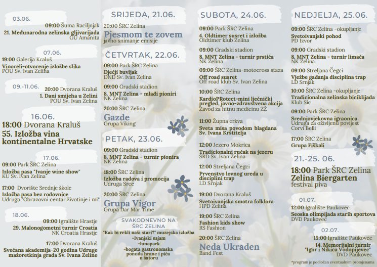 Vrijedi istaknuti i da će se u srijedu, 21. lipnja održati javno snimanje emisije „Pjesmom te zovem“ u 20 sati u ŠRC Zelina. Osim toga, posjetitelji mogu uživati i u koncertima, a ulaz na koncerte je besplatan.
