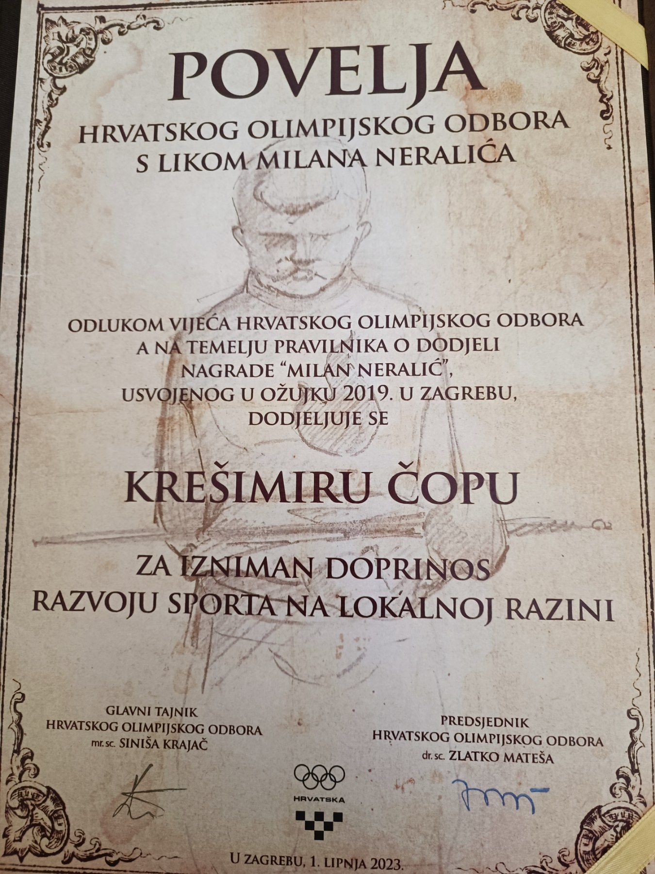 Krešimir Čop, predsjednik Saveza športova Varaždinske županije dobio je uglednu nagradu Hrvatskog olimpijskog odbora, Povelju s likom Milana Neralića za izniman doprinos razvoju sporta na lokalnoj razini.