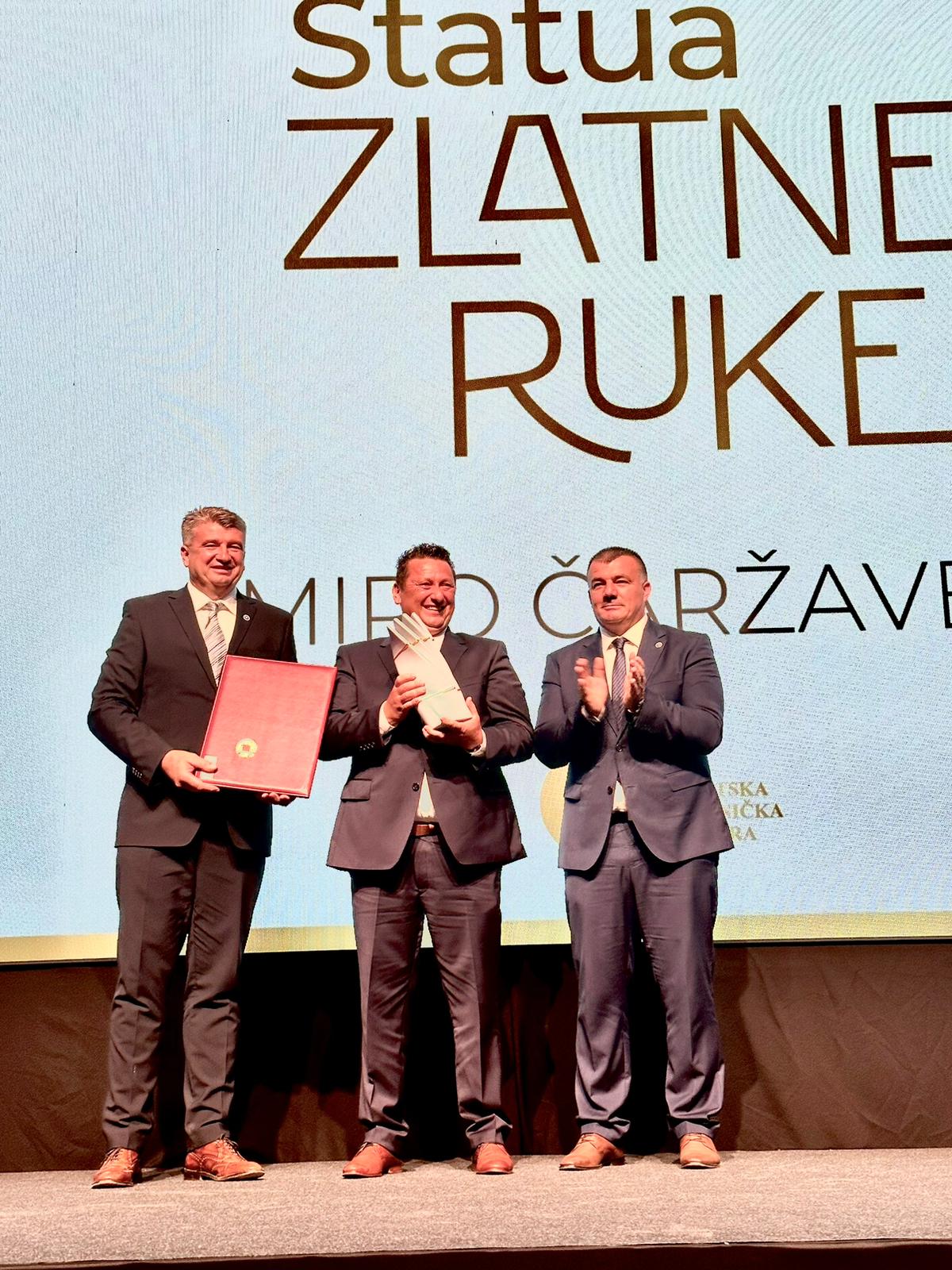 Najprestižnije priznanje Hrvatske obrtničke komore – Statua ‘Zlatne ruke’ s poveljom, koja se dodjeljuje kao priznanje za dugogodišnji uspješan rad u obrtu i izniman doprinos razvoju hrvatskog obrtništva, ove je godine pripala petero hrvatskih obrtnica i obrtnika među kojima je i član Obrtničke komore Krapinsko – zagorske županije Miro Čaržavec, vlasnik obrta za završne radove, proizvodnju i trgovinu ‘Čaržavec’ iz Velikog Trgovišća.
