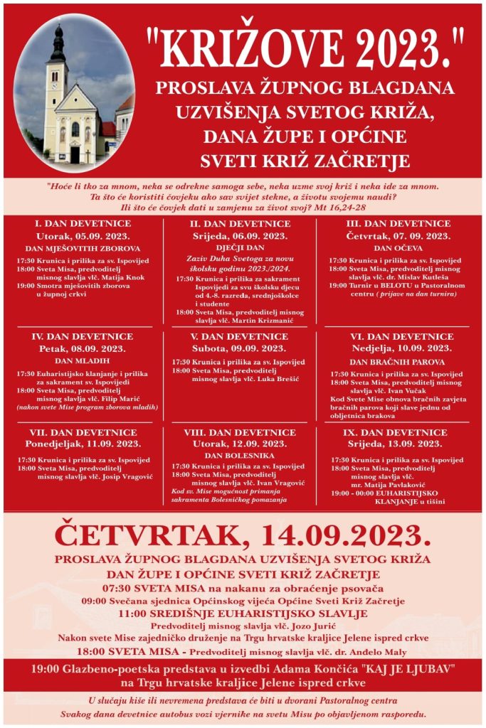 Ususret proslavi Dana Župe Uzvišenja Svetog Križa i Općine Sveti Križ Začretje, preč. Vladimir Drnetić, župnik i dekan Krapinskog dekanata, najavljuje ‘devetnicu’ gdje će se, osim molitvenog i duhovnog programa, održavati i prigodni koncerti te razna događanja.