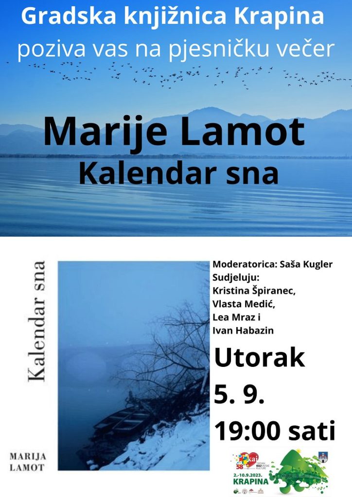 Isti dan u 19 sati slijedi Marija Lamot – Predstavljanje pjesništva uz goste, a u srijedu, 10. rujna u 18 sati bit će predstavljanje knjige „Lado“ – Hrvatska tradicijska glazbala i sastavi“ – autori i urednici – nastup Lado.
