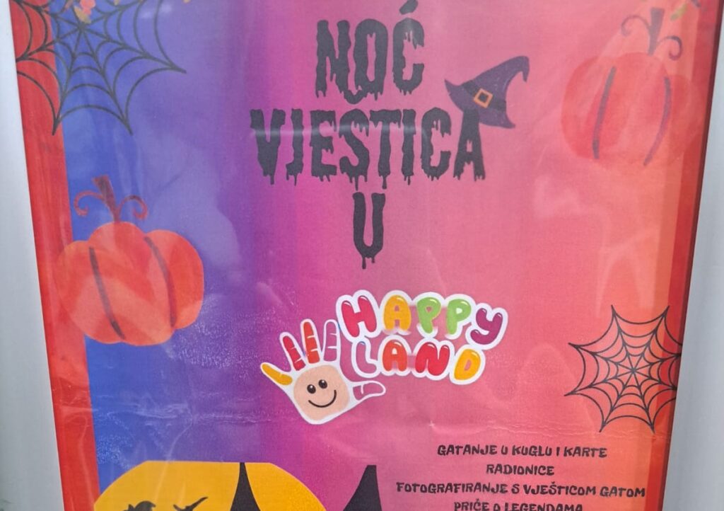 - U dječjoj igraonici “Happy Land” održat će se 31. listopada 2023. razne aktivnosti (gatanje u kuglu i karte, fotografiranje s vješticom Gatom…).