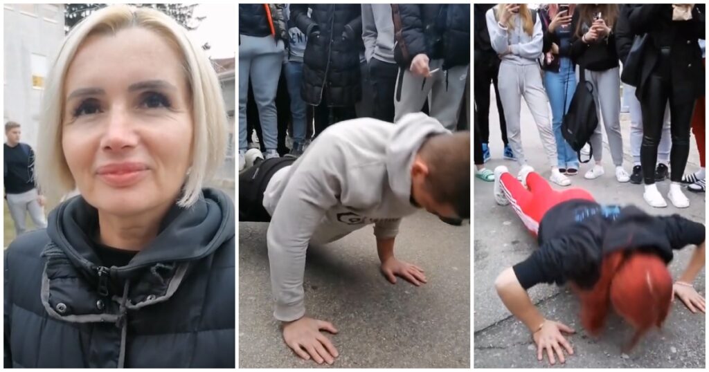 Naime, kako je to zabilježio Ivan Pernar ispred spomenute srednje škole okupili su se učenici i profesorica, a zadatak je bio jednostavan – napravite 100 sklekova za 100 eura.