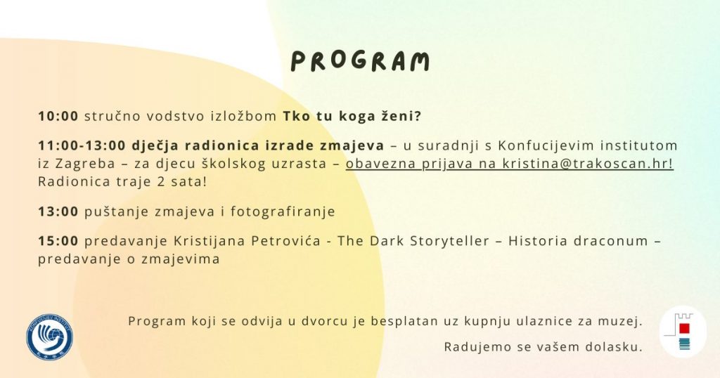 Zabava počinje u 10 sati stručnim vodstvom kroz izložbu ‘Tko tu koga ženi?’, a nastavlja se dječjom radionicom izrade zmajeva koja se održava u suradnji s Konfucijevim institutom. Radionica je namijenjena djeci školskog uzrasta, a prijava je obavezna putem e-pošte [email protected]. Radionica traje 2 sata, od 11 do 13 sati.