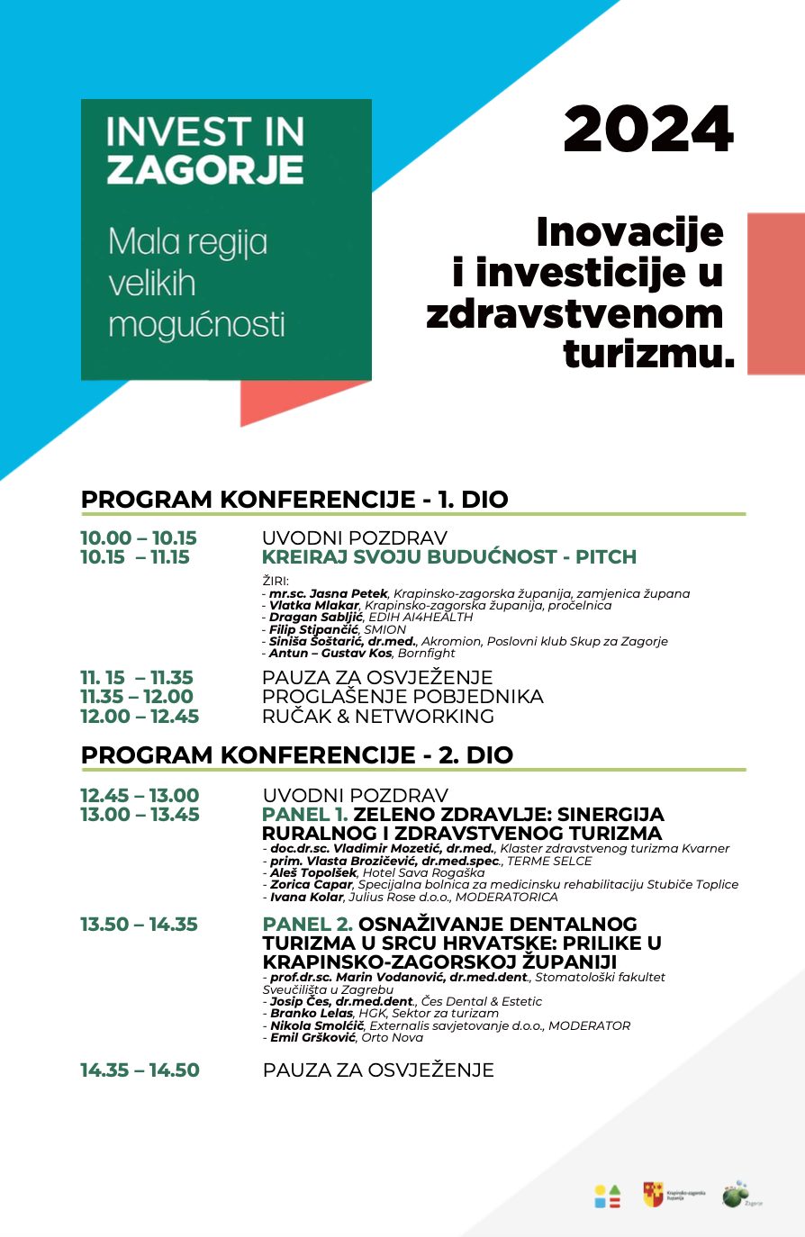 U prvom dijelu konferencije, srednjoškolski timovi će se natjecati u programu “Kreiraj svoju budućnost”, predstavljajući svoje startup ideje usmjerene na zdravstveni turizam. Devet timova izložit će inovativna rješenja koja imaju potencijal unaprijediti sektor zdravstvenog turizma, pred stručnim žirijem. Pobjednik, odabran na osnovu kreativnosti i potencijala njihove ideje, bit će nagrađen od strane Krapinsko – zagorske županije, čime se potiče razvoj mladih talenata u ovom važnom sektoru.