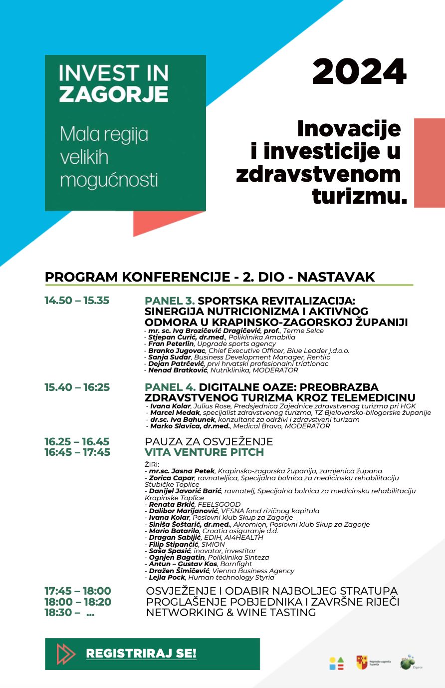 Završni segment konferencije, ‘VitaVenturePitch’, bit će prava poslastica za sve ljubitelje inovacija u zdravstvenom turizmu. Odabrani startupovi iz cijele Hrvatske predstavit će svoje revolucionarne ideje i rješenja koja imaju potencijal promijeniti lice zdravstvenog turizma. Ovo natjecanje ne samo da slavi kreativnost i poduzetnički duh, već i otvara vrata novim prilikama i suradnjama u ovom sve popularnijem sektoru. Prezentacije će biti živopisne, a konkurencija žestoka, dok se svi natječu za titulu najinovativnijeg startupa u zdravstvenom turizmu. Uz titulu najinovativnijeg startupa, Krapinsko – zagorska županija nagrađuje najbolji tim nagradom od 7500 eura, a Infobip, partner konferencije s dodatnih 5000 eura kredita i ulazak u Infobip ‘StartupTribe’.