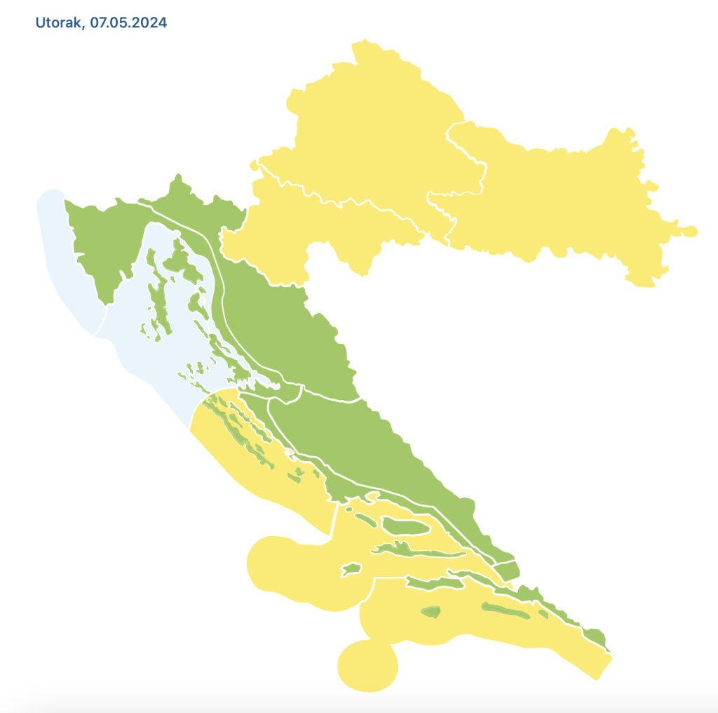 Za dobar dio zemlje danas je na snazi žuto upozorenje, pa tako i za našu Zagrebačku regiju. Kako je istaknuto, očekuje se grmljavinsko nevrijeme, te lokalno mogući izraženi pljuskovi praćeni grmljavinom.