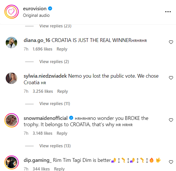 Isti komentari mogu se pronaći i na službenim stranicama Eurosonga ispod vijesti o pobjedi Švicarske.