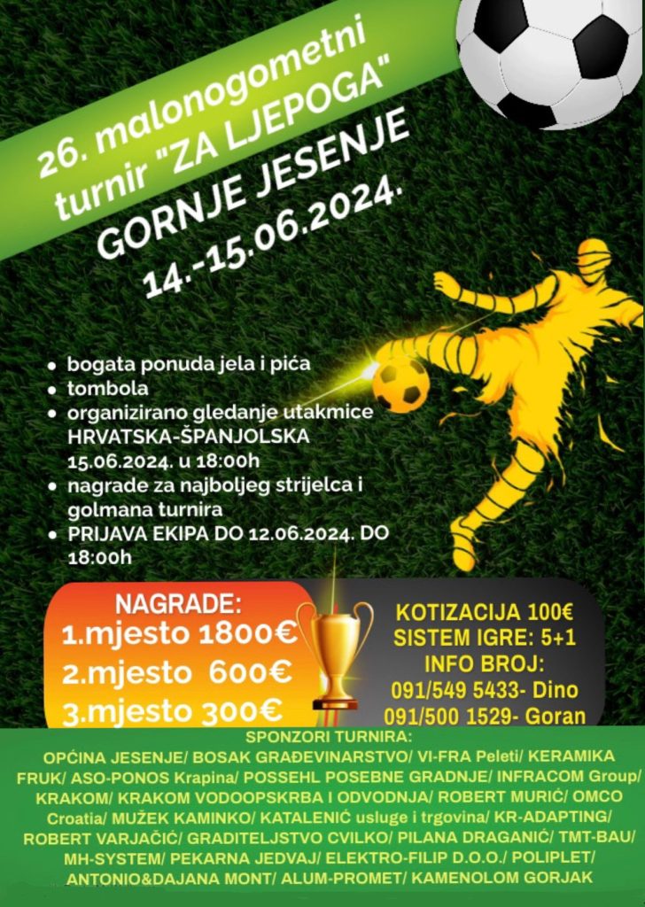 Jedan od najdugovječnijih malonogometnih turnira, turnir “Za Ljepoga“ u Gornjem Jesenju, otvorio je prijave za svoje 26. izdanje koje se primaju do 12. lipnja do 18 sati.