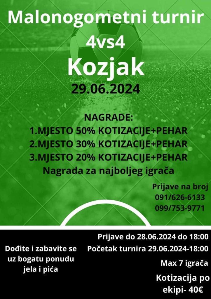 Sutra s početkom u 18 sati u Kozjaku Začretskom počinje malonogometni turnir ‘Kozjak 4vs4’. Prijave traju do danas u 18 sati, kada će biti održano i izvlačenje parova. Igra se na asfaltnom igralištu u sustavu 3+1.