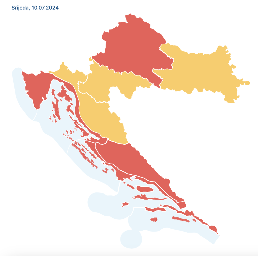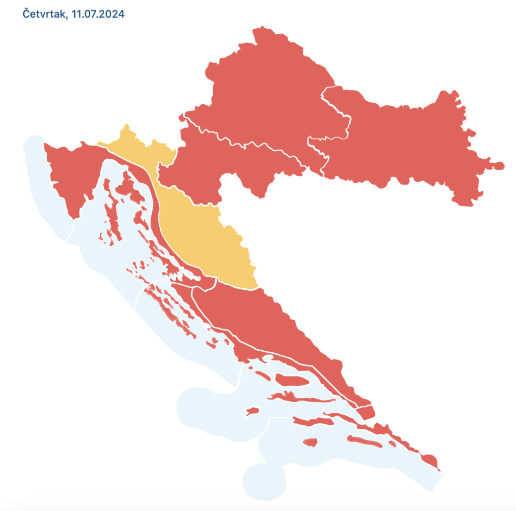 DHMZ je za našu regiju, zagrebačku, izdao crveno upozorenje zbog izuzetno opasnog vremena i toplinskog vala. Crveno upozorenje na snazi je još u riječkoj, splitskoj, kninskoj i dubrovačkoj regiji, dok je u gospićkoj, karlovačkoj i osječkoj regiji na snazi narančasto upozorenje.