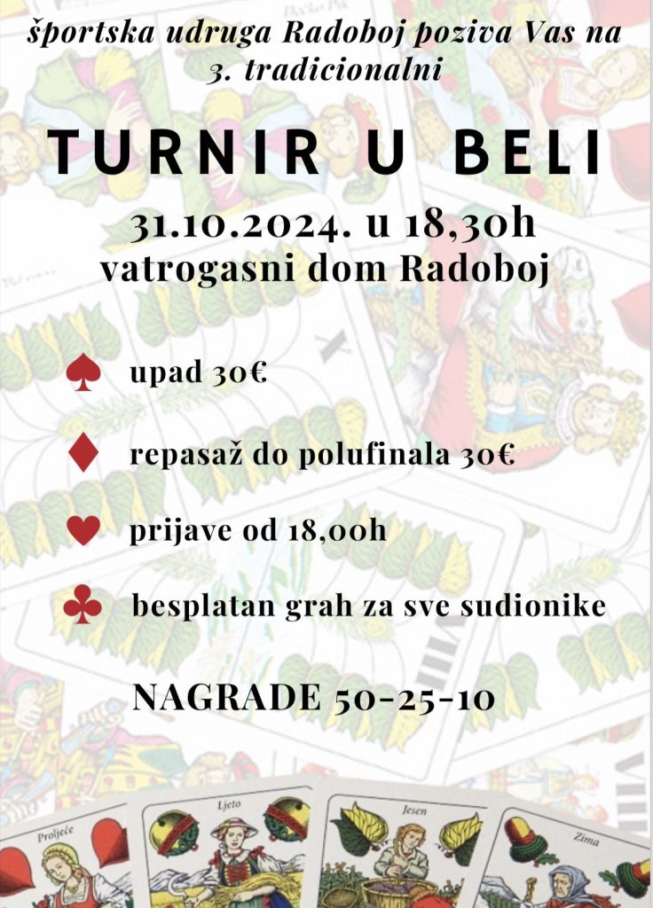 Športska udruga Radoboj poziva sve zainteresirane na 3. tradicionalni Turnir u beli sutra, 31. listopada, s početkom u 18:30 u Vatrogasnom domu u Radoboju.