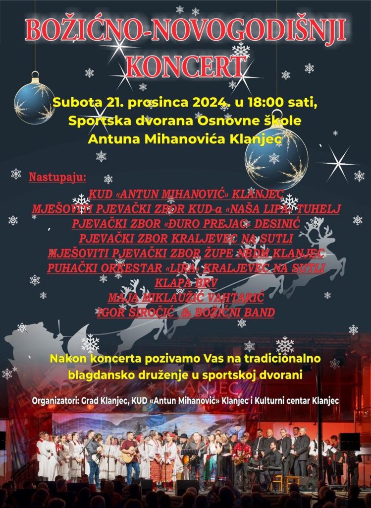 Kruna blagdanskih događanja u Klanjcu bit će kao i svake godine tradicionalni božićno – novogodišnji koncert KUD-a ‘Antun Mihanović’ u subotu, 21. prosinca u 18 sati u Sportskoj dvorani Osnovne škole. Kao i svake godine, KUD ‘Antun Mihanović’ okupit će na koncertu gotovo sve glazbene amatere iz svog kraja, njih više od dvjesto.
