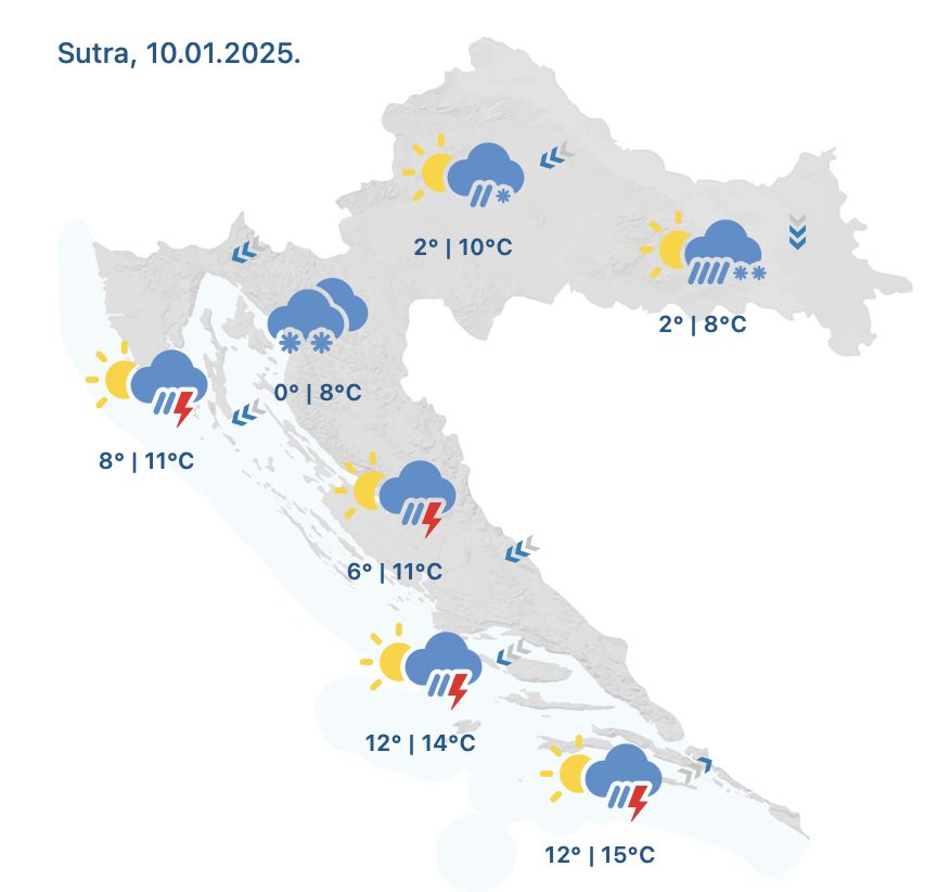 Prijepodne na kopnu oblačno s kišom koja će uz zamjetan pad temperature prelaziti u snijeg i stvarati snježni pokrivač uglavnom u gorju. Sredinom dana prestanak oborine, popodne smanjenje naoblake sa sjevera. Na Jadranu promjenjivo, povremena kiša i grmljavina, na sjeveru ujutro, u Dalmaciji popodne.