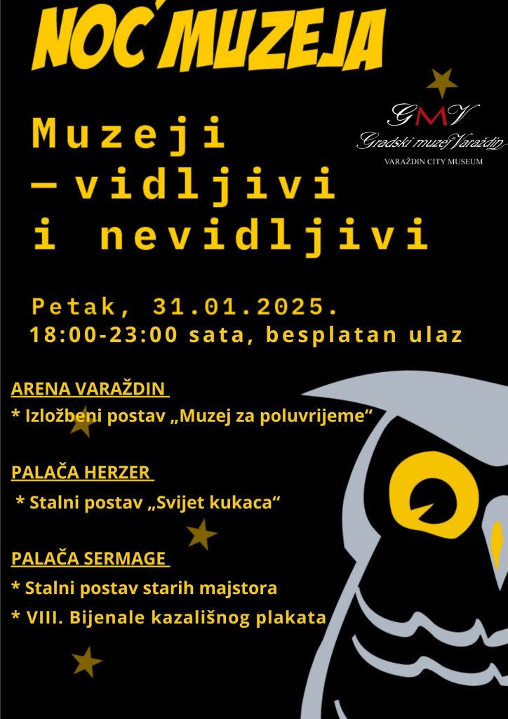 ‘Noć muzeja’, koja se u koordinaciji Hrvatskog muzejskog društva održava u petak, 31. siječnja, u Gradskom muzeju Varaždin priređuje se na trima lokacijama: u palači Herzer (Franjevački trg 10), palači Sermage (Trg M. Stančića 3) i u Areni Varaždin (Šetalište Franje Tuđmana 1).