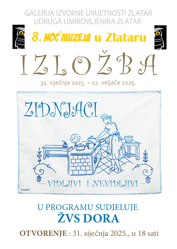 U Zlataru će se ona 8. puta obilježiti u Galeriji izvorne umjetnosti izložbom zidnjaka (zidne krpe). Naime, zlatarska Udruga umirovljenika svake godine, u suradnji s Galerijom izvorne umjetnosti, organizira jedan likovni događaj, najčešće s etno predznakom. Ove godine odlučila se za izložbu “Zidnjaci-vidljivi i nevidljivi“ u ‘Noći muzeja’.