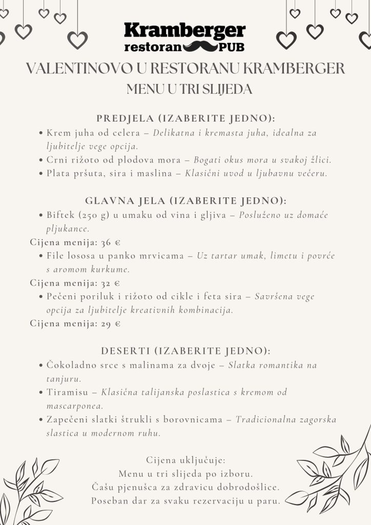 Za sve koji traže savršeno mjesto za proslavu svoje ljubavi, restoran Kramberger u Krapini nudi izvanredno iskustvo povodom Valentinova! Posebna ponuda u tri slijeda oduševit će parove raznovrsnim jelima i ugodnom atmosferom i učiniti vaš poseban dan nezaboravnim.