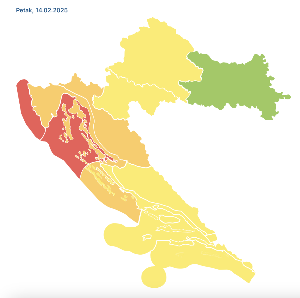 Za cijelu su zemlju na snazi upozorenja, osim za krajnji istok. Za našu, zagrebačku regiju, upaljeno je žuto upozorenje zbog snijega i poledice. Za zapadnu obalu Istre na snazi je crveno upozorenje zbog moguće olujne bure s udarima do 120 km/h. Također, za riječku regiju na snazi je narančasti meteoalarm zbog mogućih udara vjetra do čak 165 km/h.