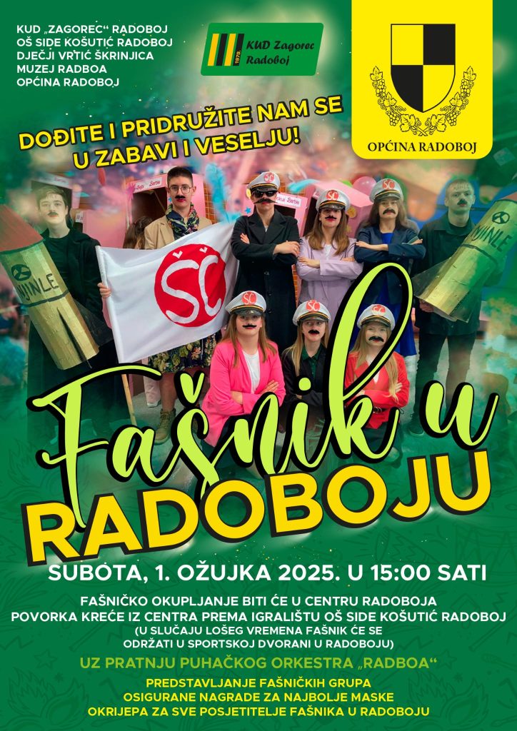Kulturno umjetničko društvo “Zagorec” Radoboj, Osnovna škola Side Košutić Radoboj, Dječji vrtić “Škrinjica”, Muzej Radboa i Općina Radoboj pozivaju vas na Fašnik u Radoboju koji će se održati u subotu 1. ožujka 2025. u 15 sati.