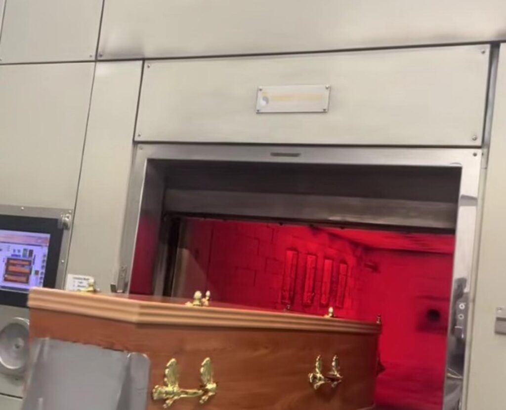 Na snimci je lijes kojeg automatski uređaj gura u komoru za kremiranje u kojoj nema plamena.