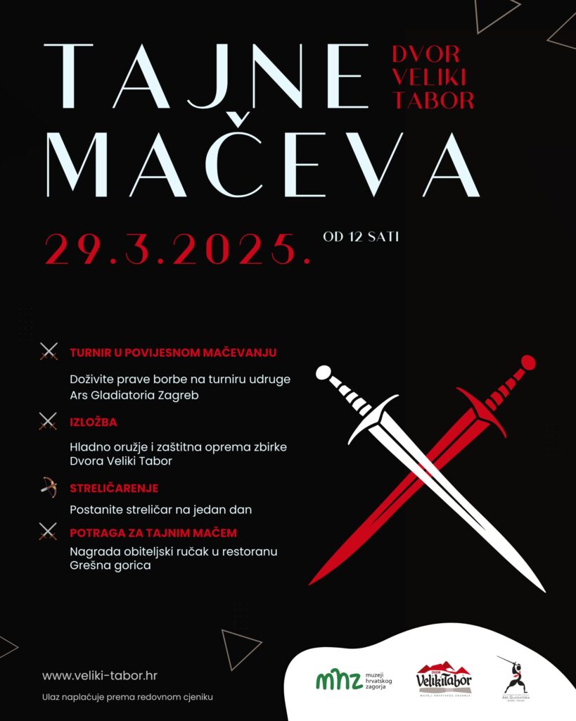Muzeji Hrvatskog zagorja pozivaju vas na jedinstveni događaj ‘Tajne mačeva’, koji će se održati u prekrasnom ambijentu Dvora Veliki Tabor! Ovaj posebni događaj obuhvaća turnir u povijesnom mačevanju, izložbu hladnog oružja i potragu za tajnim mačem.