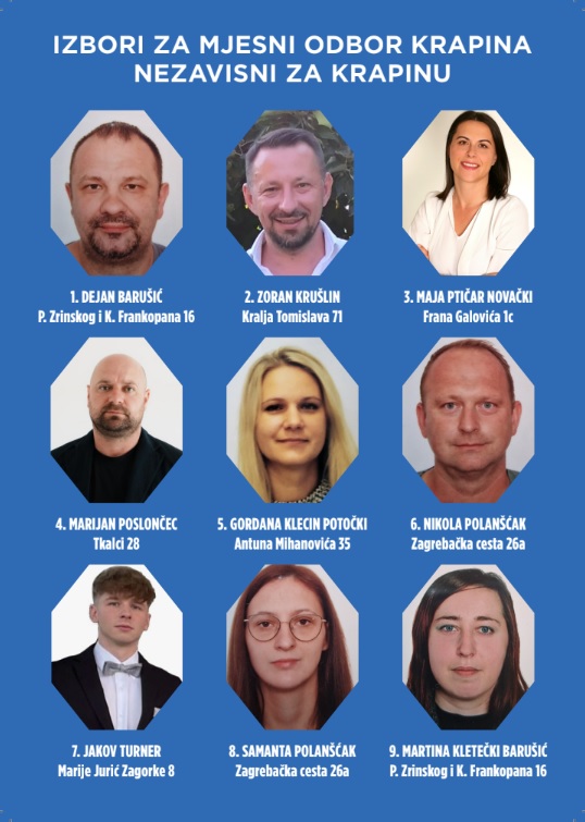 Nositelj liste ‘Nezavisni za Krapinu’ u Mjesnom odboru Krapina, je Dejan Barušić (40) iz Ulice P. Zrinskog i K. Frankopana. Uz njega su na listi Zoran Krušlin, Maja Ptičar Novački, Marijan Poslončec, Gordana Klecin Potočki, Nikola Polanščak, Jakov Turner, Samanta Polanščak i Martina Kletečki Barušić.