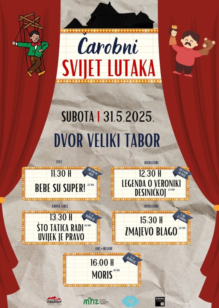 Ove subote, 31. svibnja, mališani i njihove obitelji imat će priliku zakoračiti u ‘Čarobni svijet lutaka’ u Dvoru Veliki Tabor u Desiniću – bogat cjelodnevni program lutkarskih predstava koje donose Kruna Tarle i suradnici, kazališne skupine LOFT, UO Clou i Ioculatori!