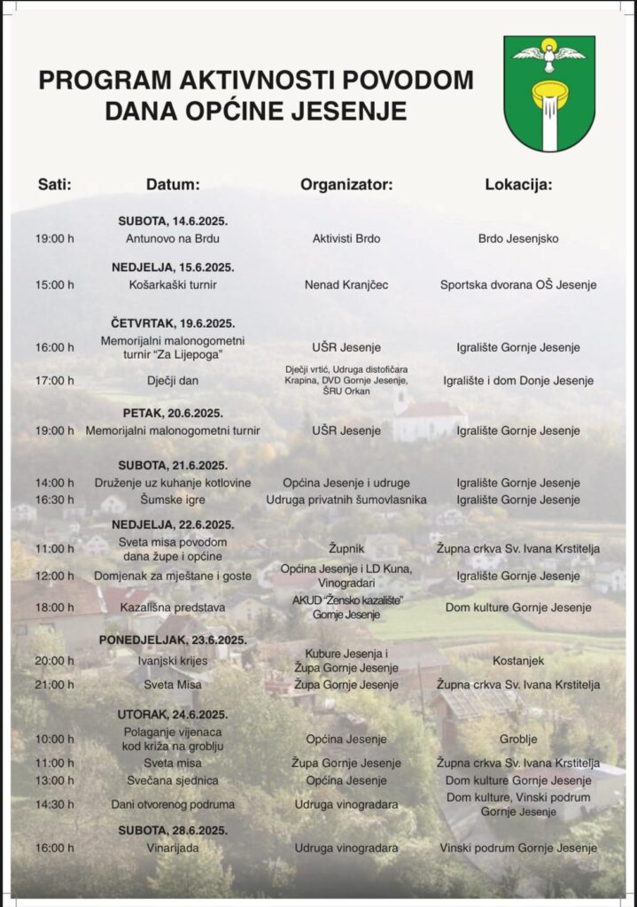 U Općini Jesenje počelo je višednevno obilježavanje Dana općine i Župe sv. Ivana Krstitelja, uz raznolika kulturna, sportska i duhovna događanja koja okupljaju mještane, goste i prijatelje Jesenja. Program je službeno započeo protekle subote tradicionalnim Antunovom u Brdu Jesenjskom te košarkaškim turnirom u nedjelju.