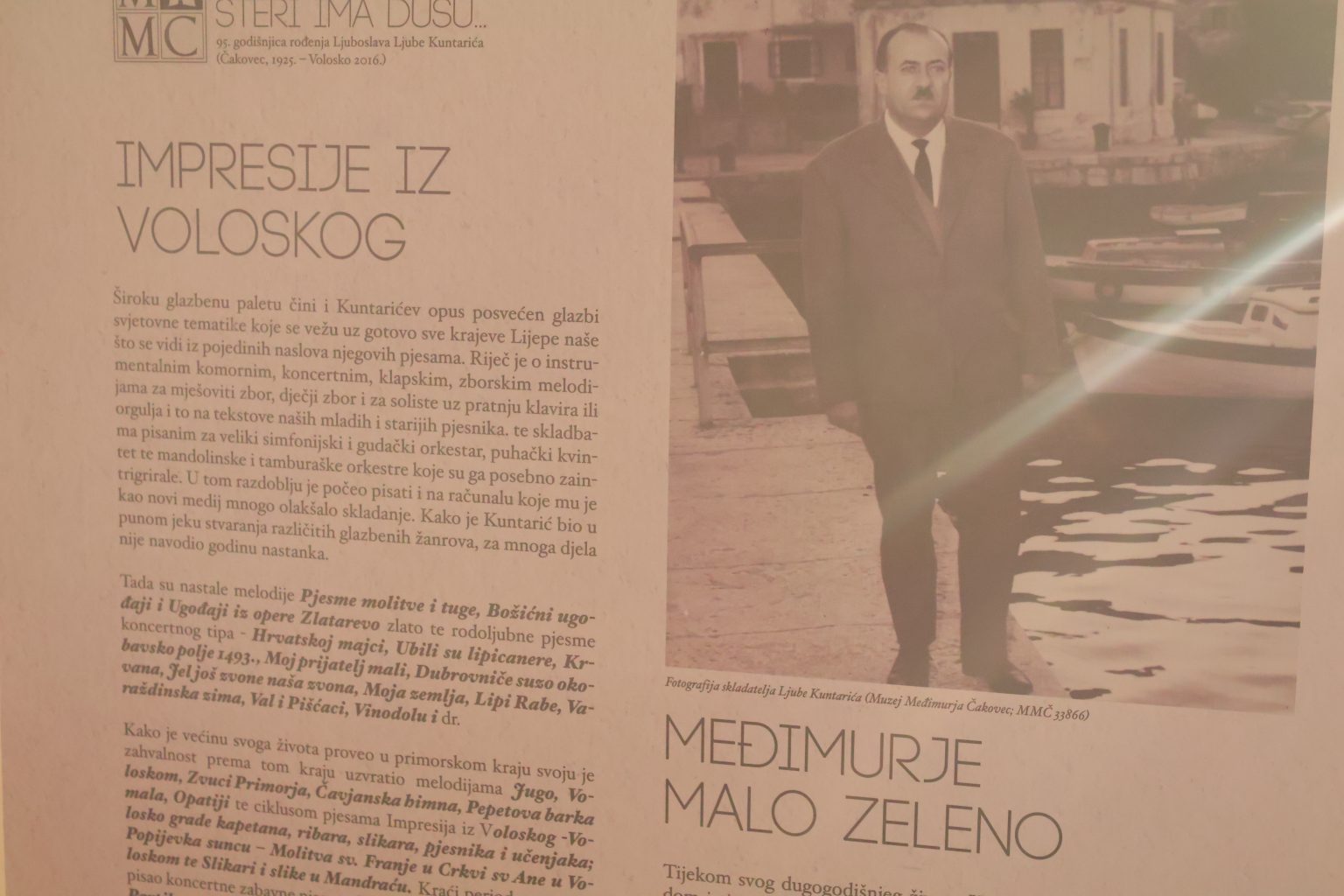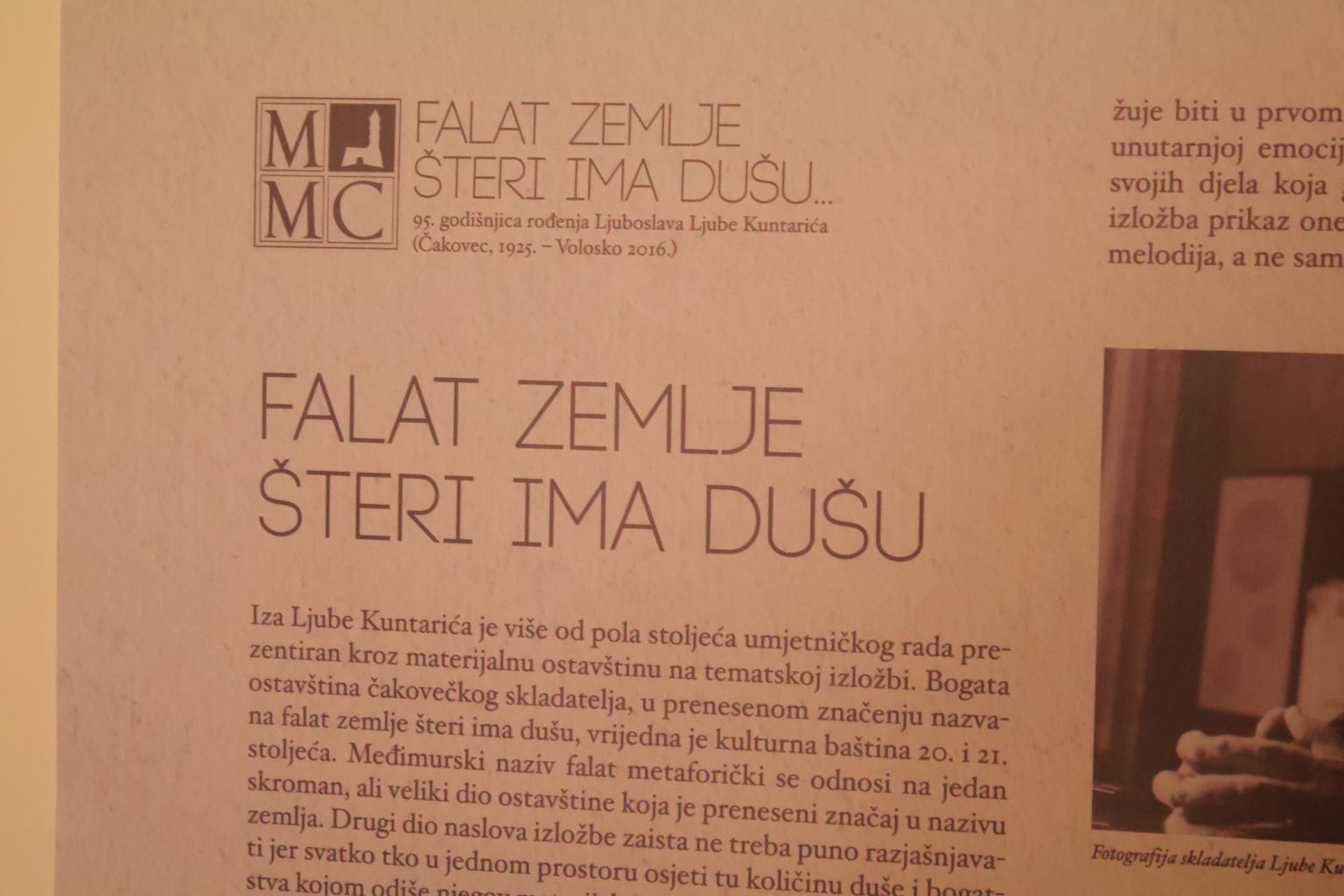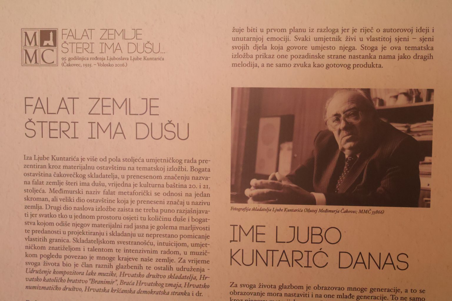Za vrijeme Okruglog stola u galerijskom prostoru Centra za kulturu Čakovec bili su postavljeni plakati izložbe pod nazivom Falat zemlje šteri ima dušu… koja je 2020. godina bila predstavljena u Muzeju Međimurja Čakovec povodom 95. godišnjice rođenja skladatelja Ljube Kuntarića, a Muzej će također ustupiti virtualnu izložbu iz 2019. godine koja će se moći pogledati na digitalnom monitoru kraj biste Ljube Kuntarića u predvorju galerijskog prostora Centra. Uz Čakovec. Spomenuta su još dva grada u kojima je stvarao – Požega i Opatija. Povezivanje kulturnih institucija je ono što baštinu upravo kroz izložbe čini živućom. U listopadu 2025. Muzej će gostovati sa svojom tematskom izložbom o opusu skladatelja Ljube Kuntarića pod nazivom Falat zemlje šteri ima dušu… u Gradskom muzeju Požega. Suradnja među muzejskim institucijama nastavit će se i u 2026. godini kada će spomenuta izložba biti predstavljena u Hrvatskom turističkom muzeju u Opatiji, čime će se zaokružiti spomenuta obljetnica i promoviranje međimurske kulturne baštine kroz muzejsku djelatnost.