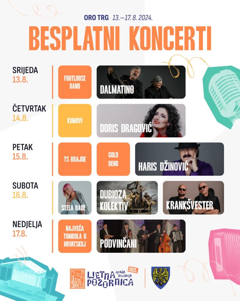 Ljetna pozornica 2025. otvara se 13. kolovoza nastupom grupe Dalmatino, dok će 14. kolovoza pozornicu preuzeti legendarna Doris Dragović. Dan kasnije, 15. kolovoza, nastupa Haris Džinović, a 16. kolovoza nas očekuje pravi spektakl: večer otvara Stela Rade, nastavlja Dubioza Kolektiv, a za kraj slijedi energični Krankšvester. Festival zatvaraju Podvinčani 17. kolovoza, kada se tradicionalno održava i veliko izvlačenje tombole.