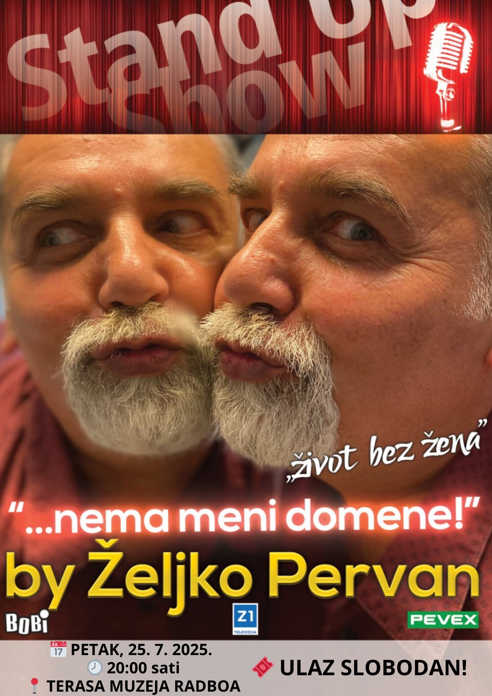 U petak, 25. srpnja, u 20 sati, na terasi Muzeja Radboa vas očekuje večer vrhunskog humora uz legendarnog Željka Pervana! Pripremite se za dozu smijeha i britke satire u jedinstvenom ambijentu pod zvijezdama.