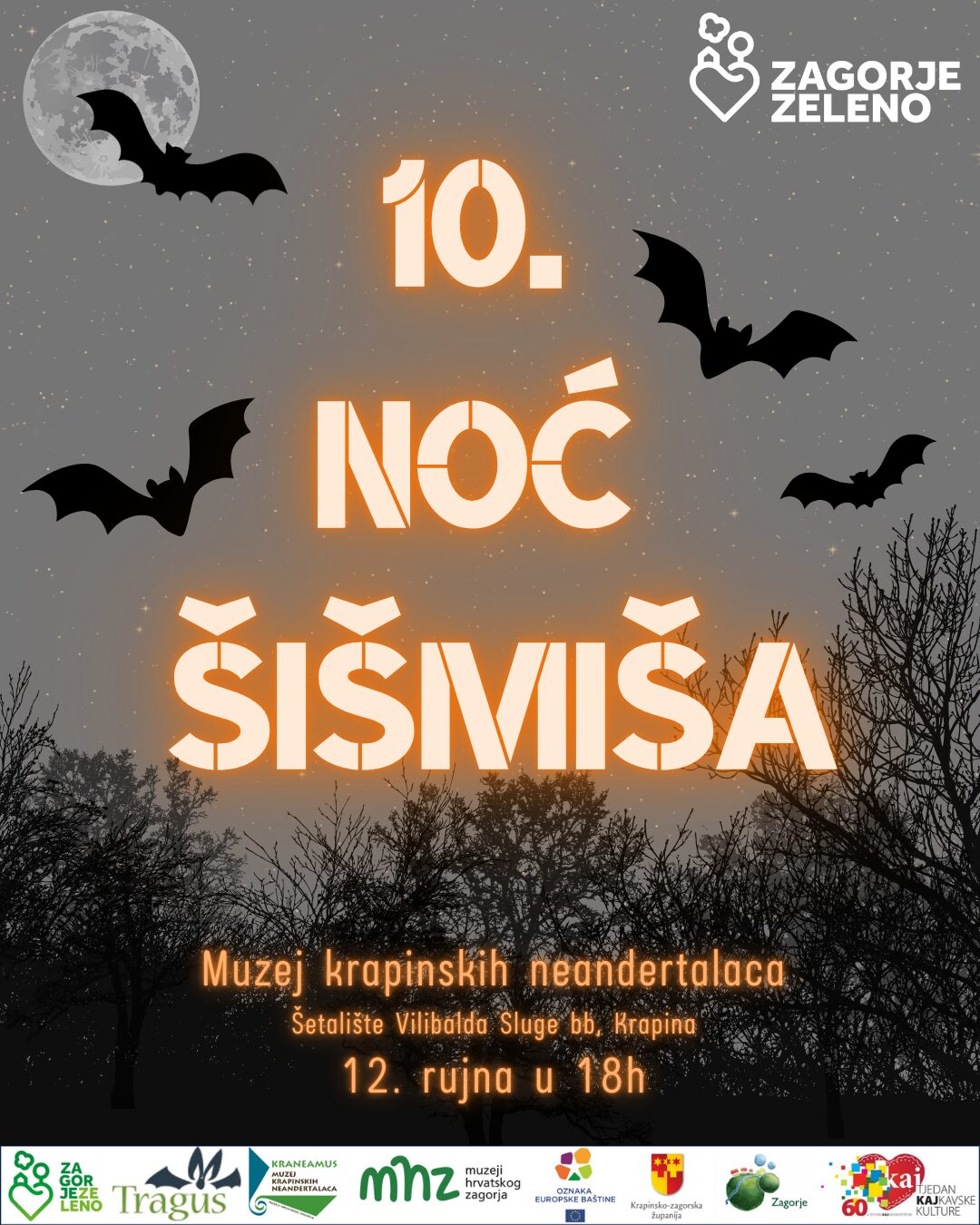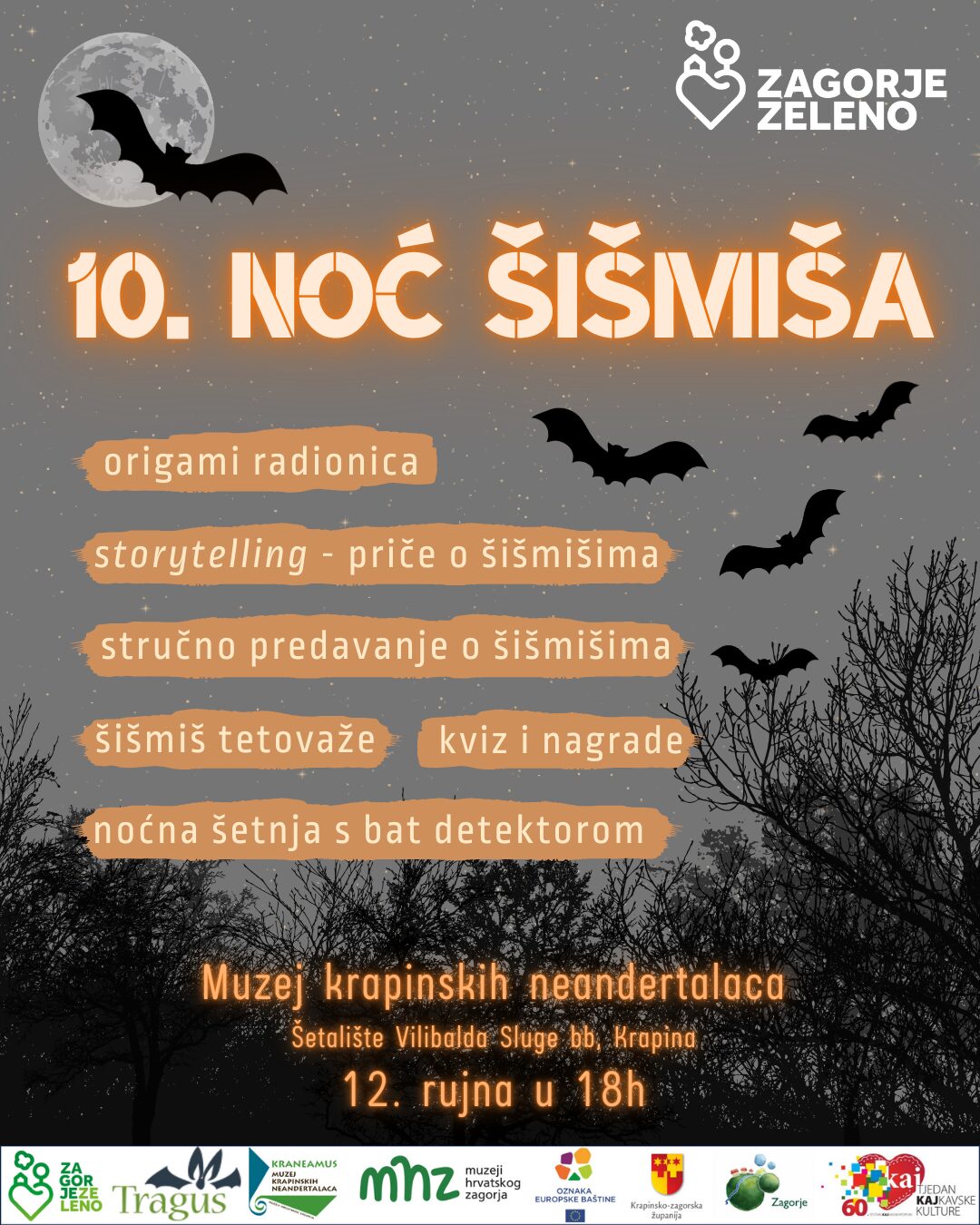 Povodom Međunarodne noći šišmiša, Javna ustanova za upravljanje zaštićenim dijelovima prirode Krapinsko – zagorske županije ‘Zagorje zeleno’, Udruga ‘Tragus’ i Muzej krapinskih neandertalaca pozivaju vas na 10. ‘Noć šišmiša’, koja će se održati u petak, 12. rujna, s početkom u 18 sati u Muzeju krapinskih neandertalaca (Šetalište Vilibalda Sluge bb, Krapina).