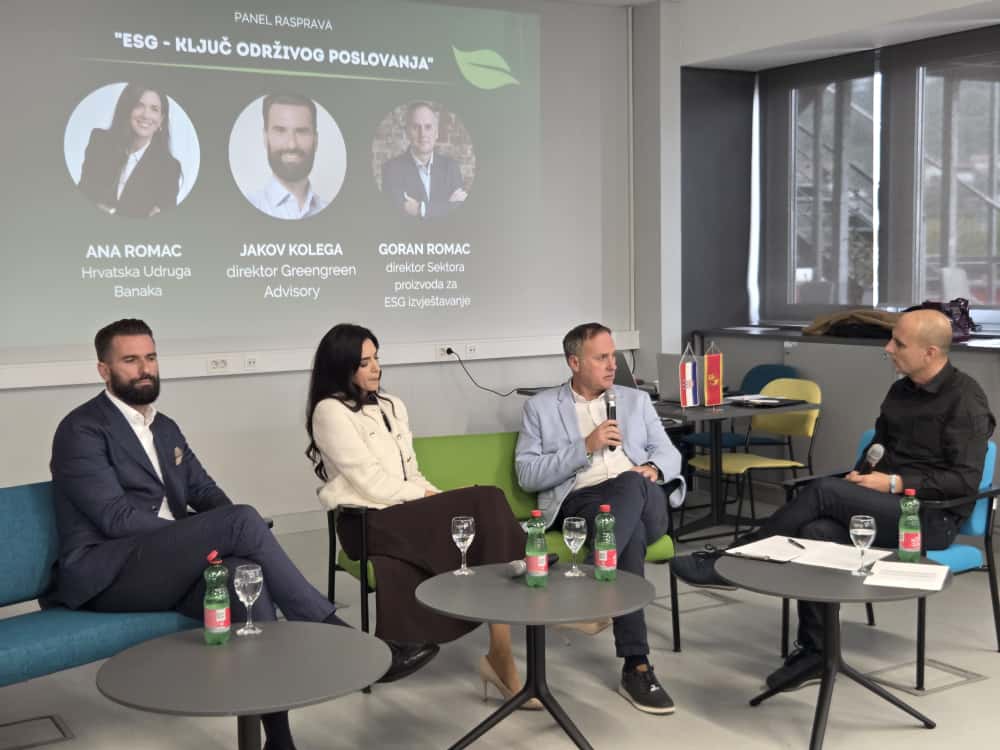 U prvom panelu pod nazivom ‘ESG – ključ održivog poslovanja’, raspravljali su Ana Romac iz Hrvatske udruge banaka, Goran Romac, direktor Sektora proizvoda za ESG izvještavanje te Jakov Kolega, direktor Greengreen Advisory. U panelu o održivom poslovanju panelisti su bili: Marina Rožić, glavna tajnica HGK-a, Dino Novosel, direktor Greenwaya, Marija Hanzec iz OEIH-a, Mario Špadina, direktor SeaCrasa te Aco Momčilović, predsjednik Global AI Ethics instituta.