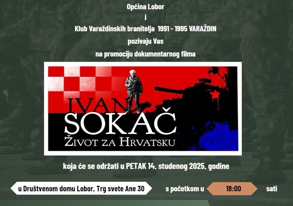 Općina Lobor i Klub varaždinskih branitelja 1991. – 1995. Varaždin sa zahvalnošću i ponosom pozivaju sve mještane, branitelje i prijatelje na promociju dokumentarnog filma ‘Ivan Sokač – Život za Hrvatsku’.