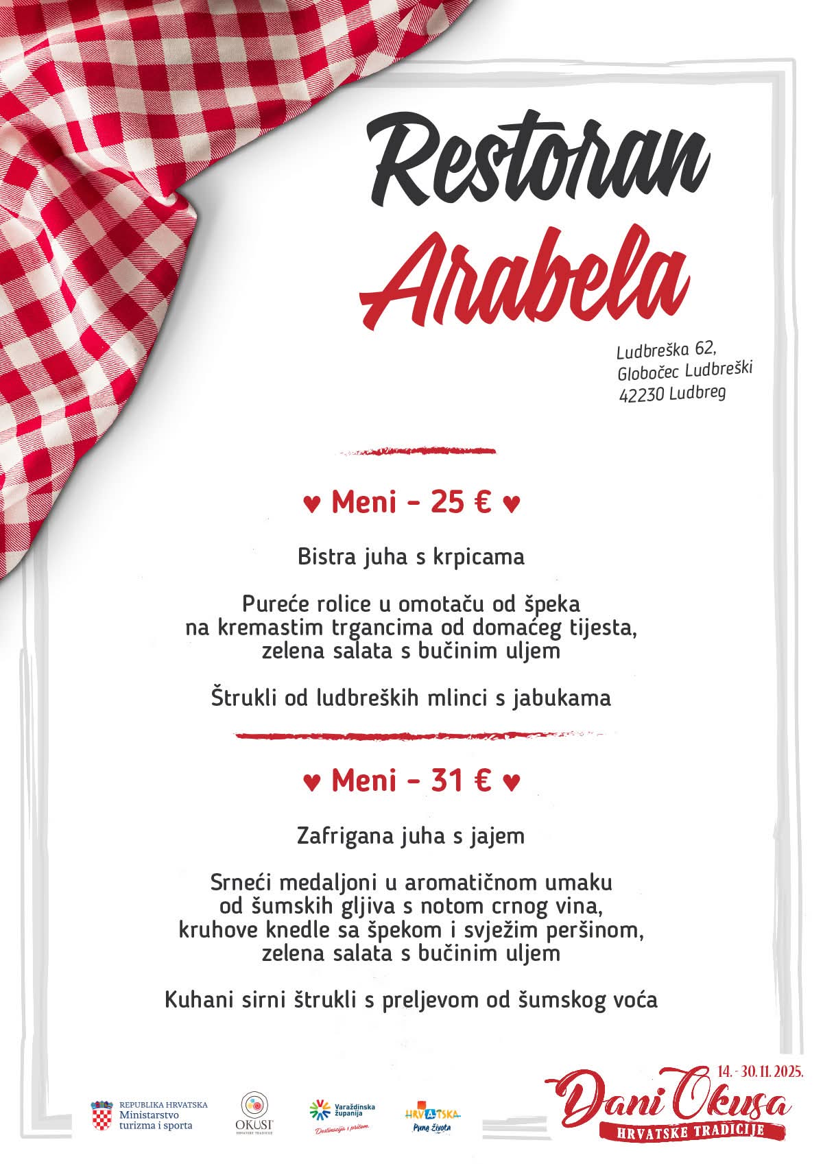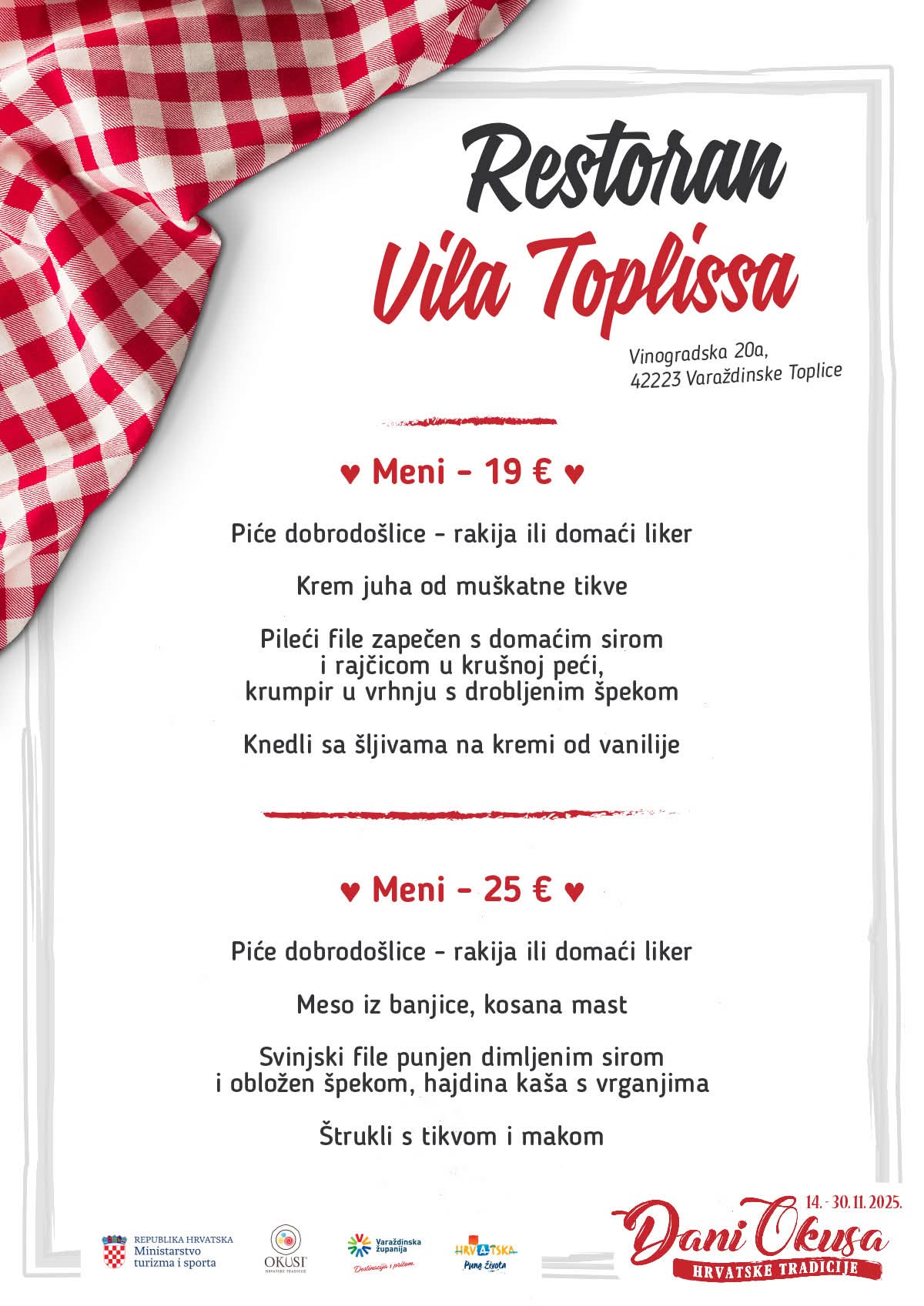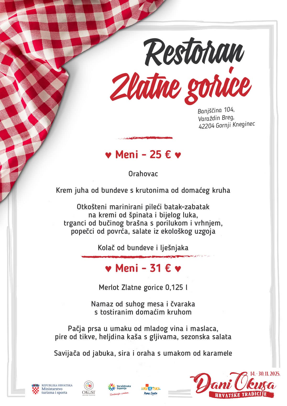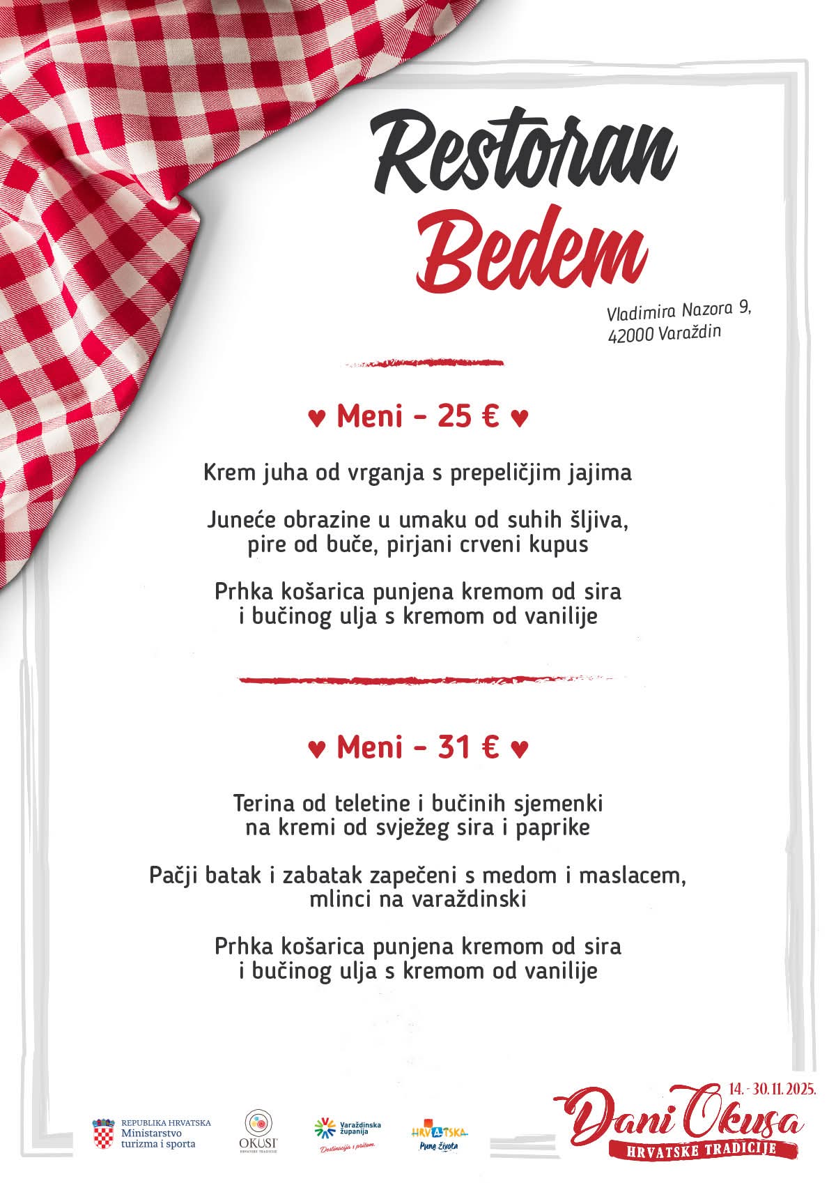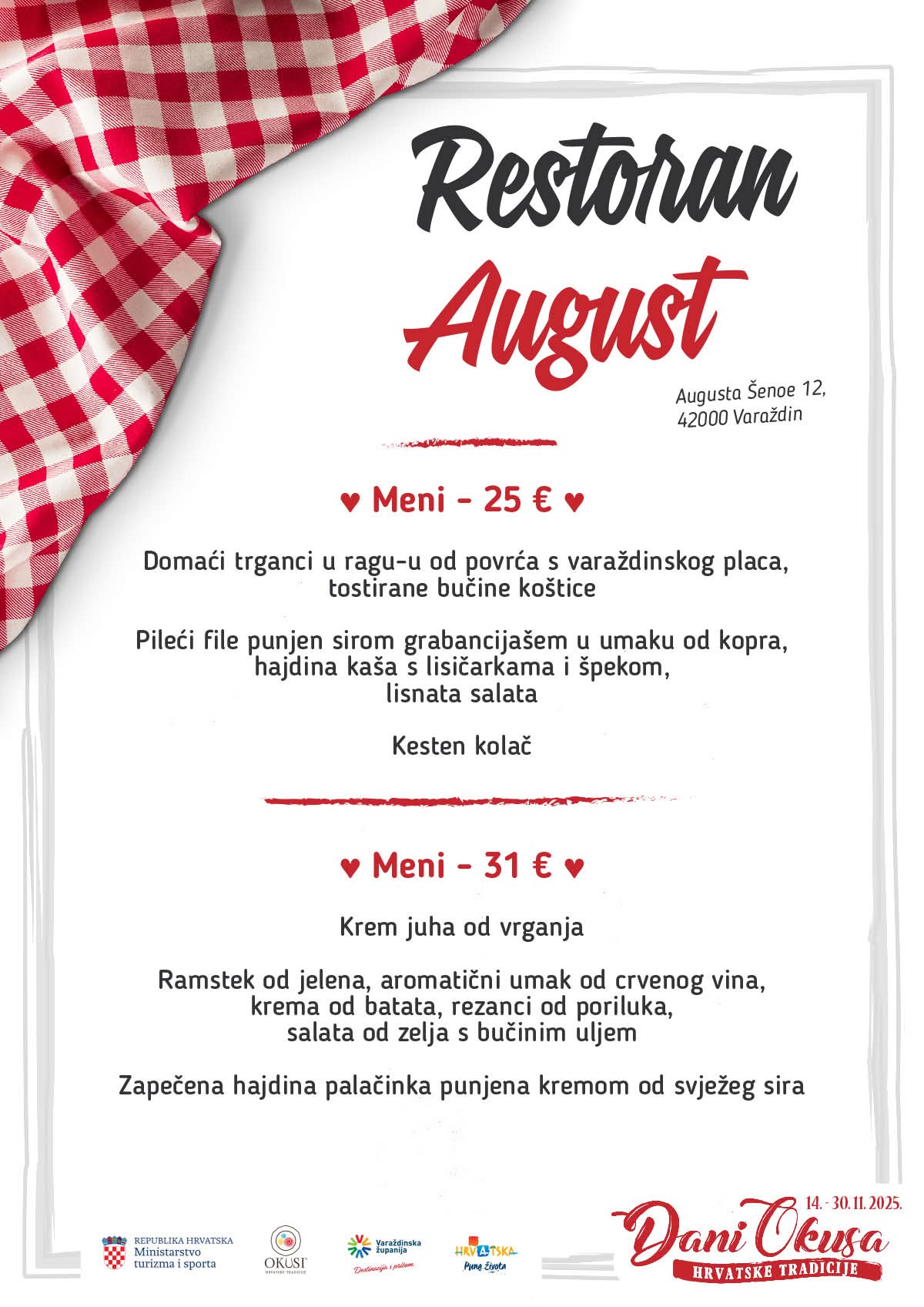 U sklopu manifestacije sudjeluje 16 ugostiteljskih objekata iz Varaždinske županije s oznakom ‘Okusi varaždinskoga kraja’ koji kroz svoje menije predstavljaju raznolikost lokalne kuhinje i tradicije. Tijekom trajanja manifestacije svaki restoran svakodnevno nudi dva promotivna menija, a svaki se sastoji od najmanje tri slijeda jela pripremljenih po tradicijskim receptima.