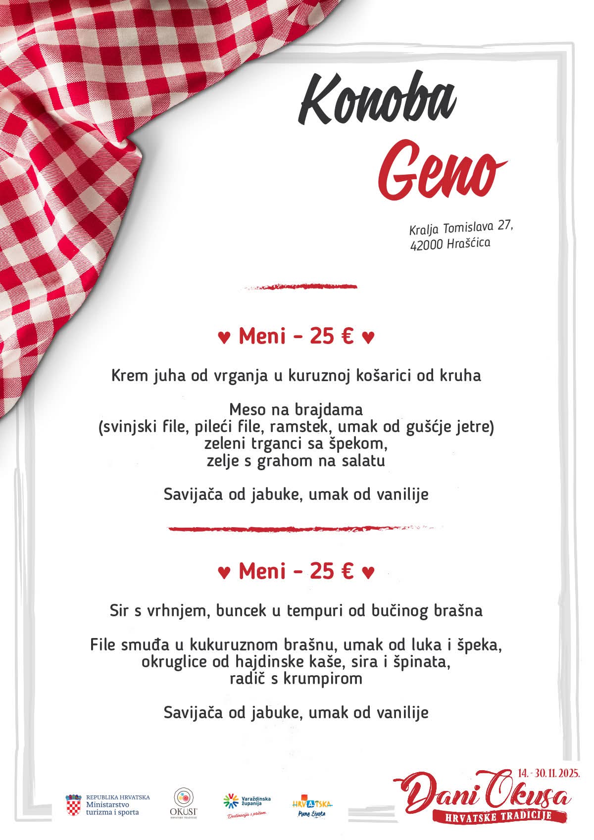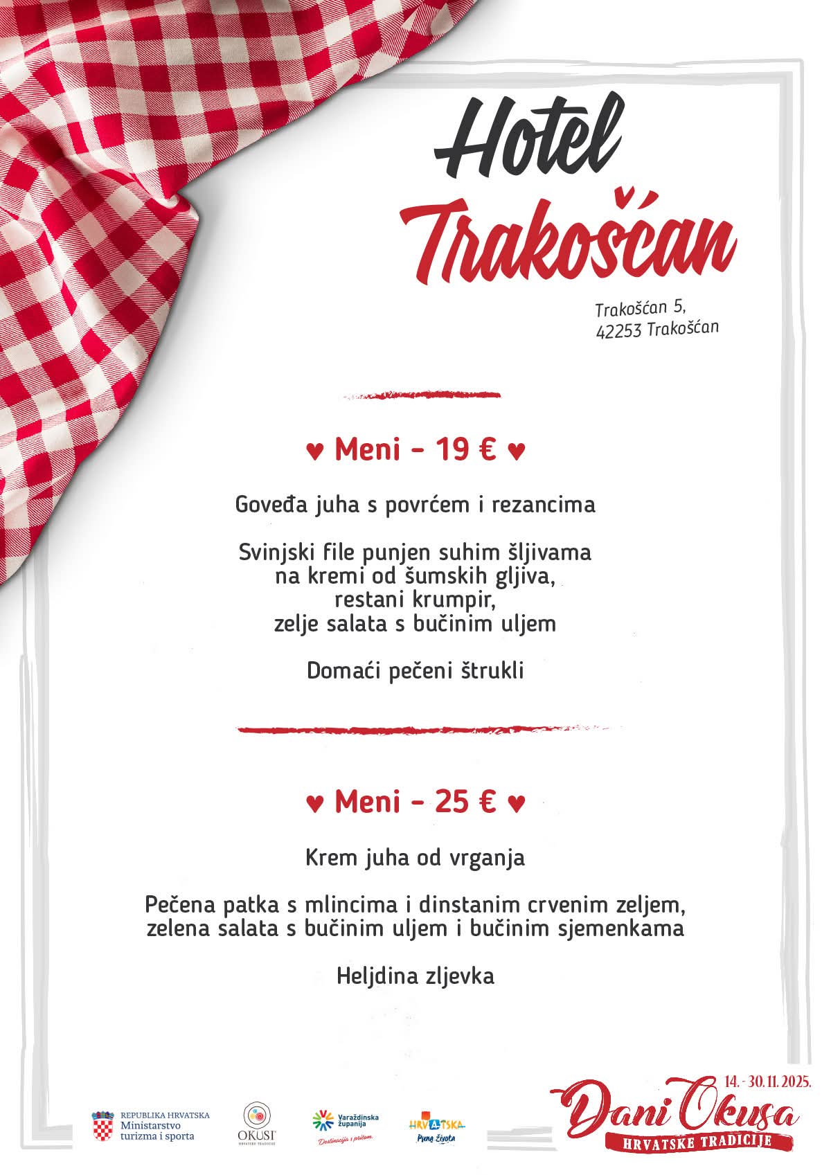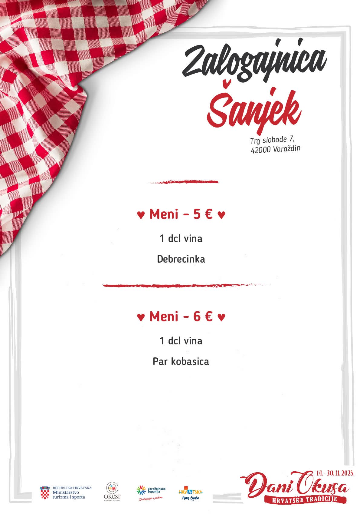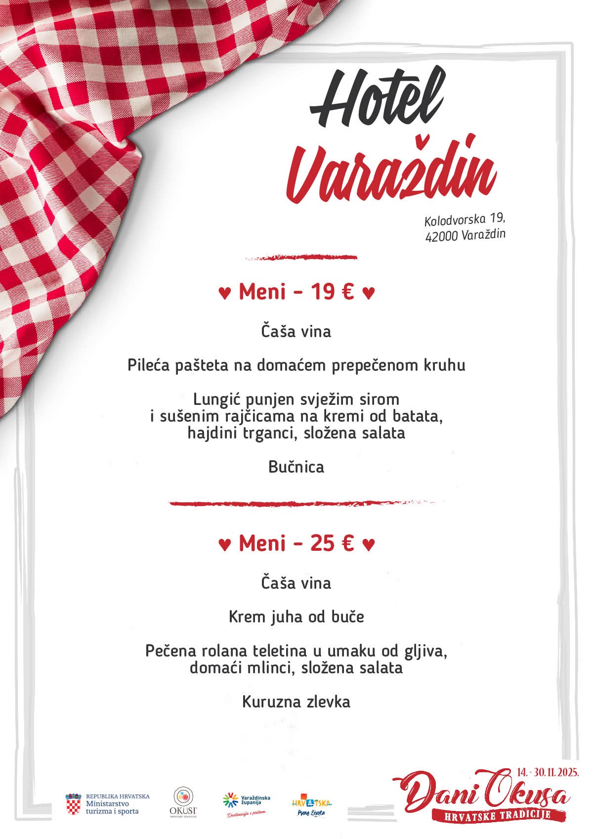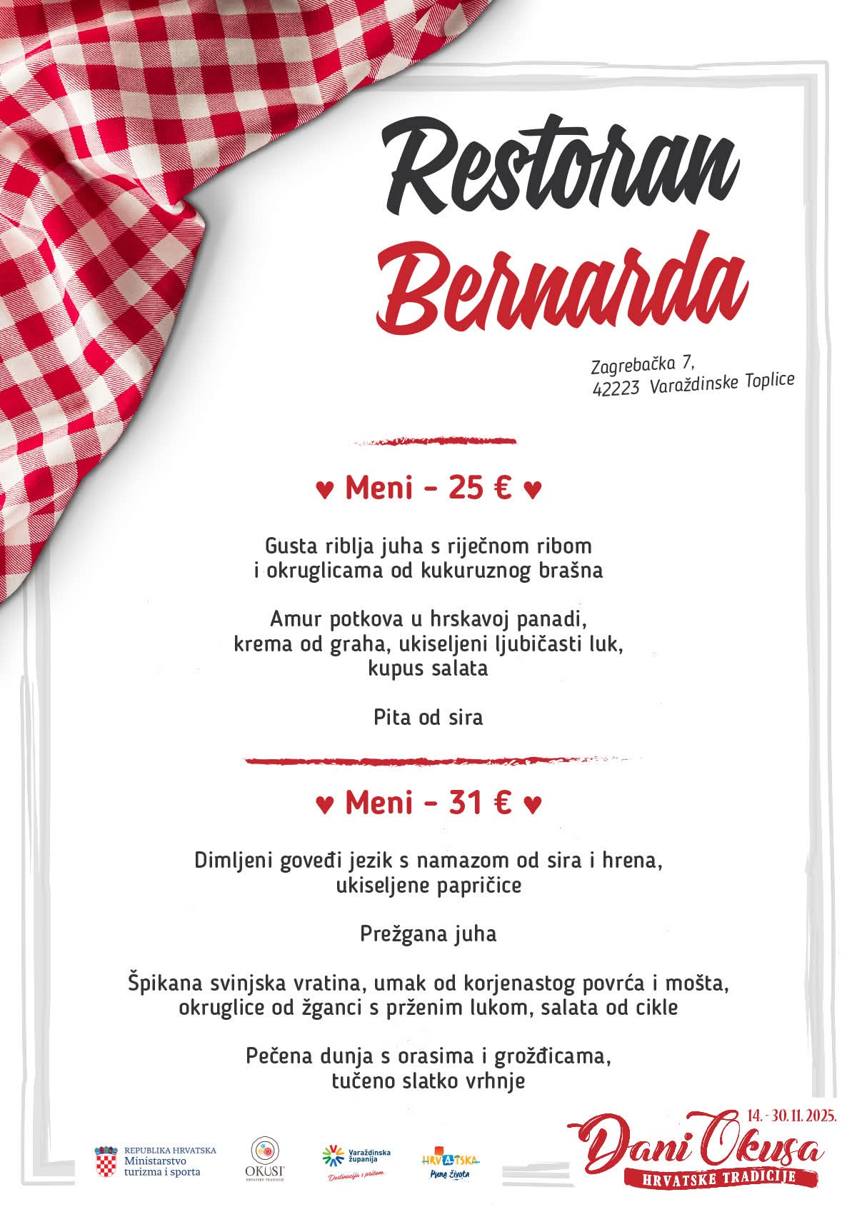 U sklopu manifestacije sudjeluje 16 ugostiteljskih objekata iz Varaždinske županije s oznakom ‘Okusi varaždinskoga kraja’ koji kroz svoje menije predstavljaju raznolikost lokalne kuhinje i tradicije. Tijekom trajanja manifestacije svaki restoran svakodnevno nudi dva promotivna menija, a svaki se sastoji od najmanje tri slijeda jela pripremljenih po tradicijskim receptima.