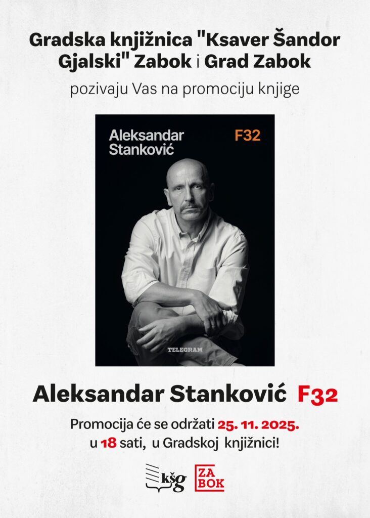 Grad Zabok i Gradska knjižnica ‘Ksaver Šandor Gjalski’ Zabok pozivaju vas na promociju nove knjige Aleksandra Stankovića, ‘F32’.