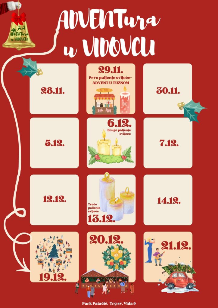 Općina Vidovec i ove godine poziva sve građane da zajedno proslave ADVENTuru u Vidovcu! Preuzmi svoj adventski kalendar, zakvači ga na frižider ili ga nosi u džepu – i neka ti ni jedan važan datum ne promakne!