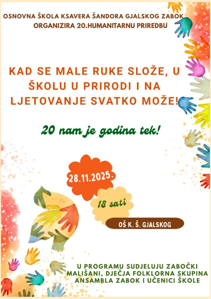 Pod motom “Kad se male ruke slože, u školu u prirodi i na ljetovanje svatko može!”, Osnovna škola Ksavera Šandora Gjalskog iz Zaboka obilježit će 20 godina održavanja svoje tradicionalne humanitarne priredbe.